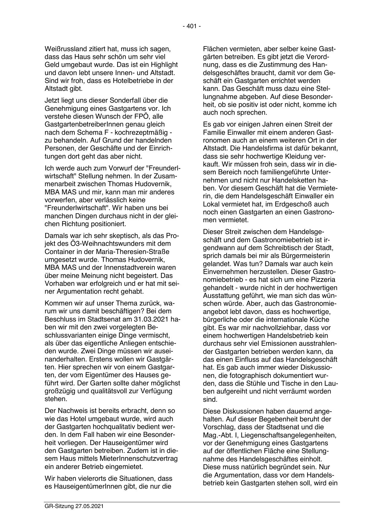 als über das eigentliche Anliegen entschieden wurde. Zwei Dinge müssen wir auseinanderhalten. Erstens wollen wir Gastgärten. Hier sprechen wir von einem Gastgarten, der vom Eigentümer des Hauses geführt wird. Der Garten sollte daher möglichst