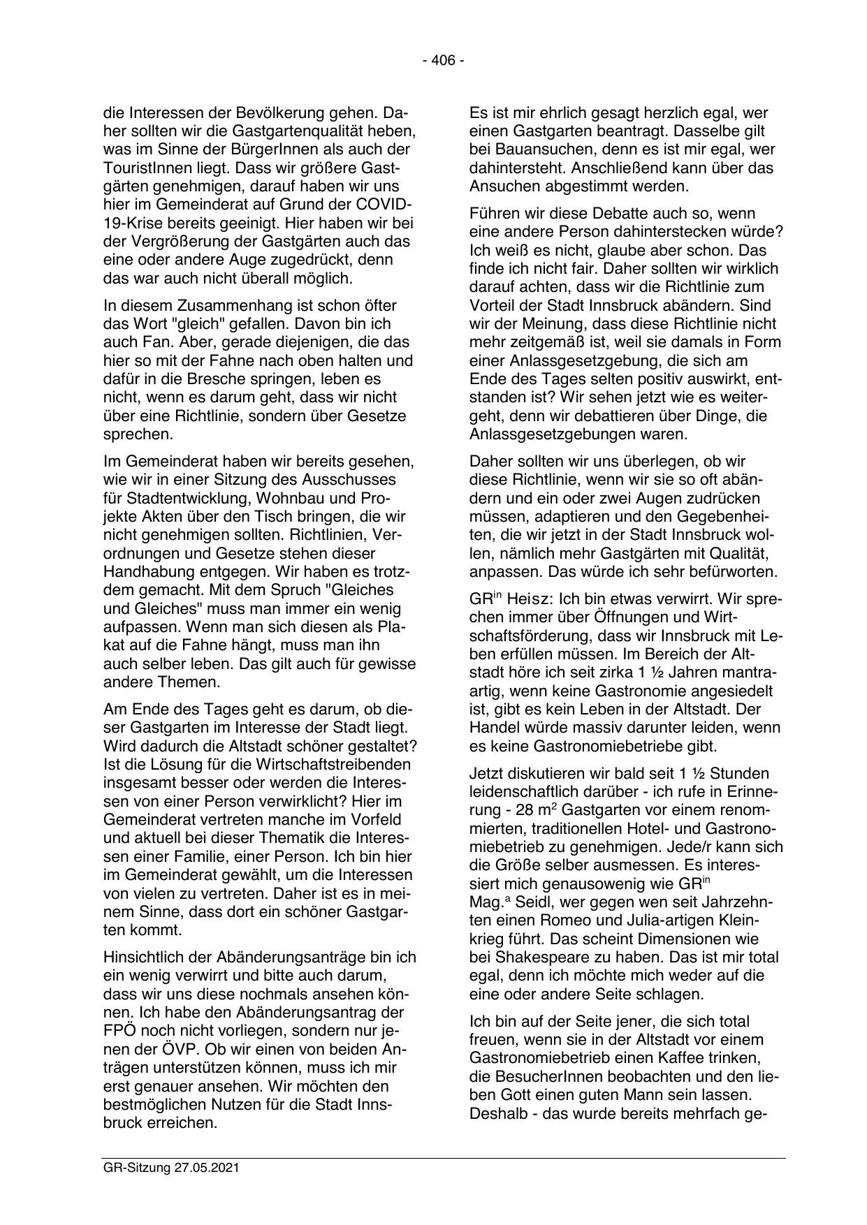 GRin Heisz: Ich bin etwas verwirrt. Wir sprechen immer über Öffnungen und Wirtschaftsförderung, dass wir Innsbruck mit Leben erfüllen müssen. Im Bereich der Altstadt höre ich seit zirka 1 ½ Jahren mantraartig, wenn keine Gastronomie angesiedelt