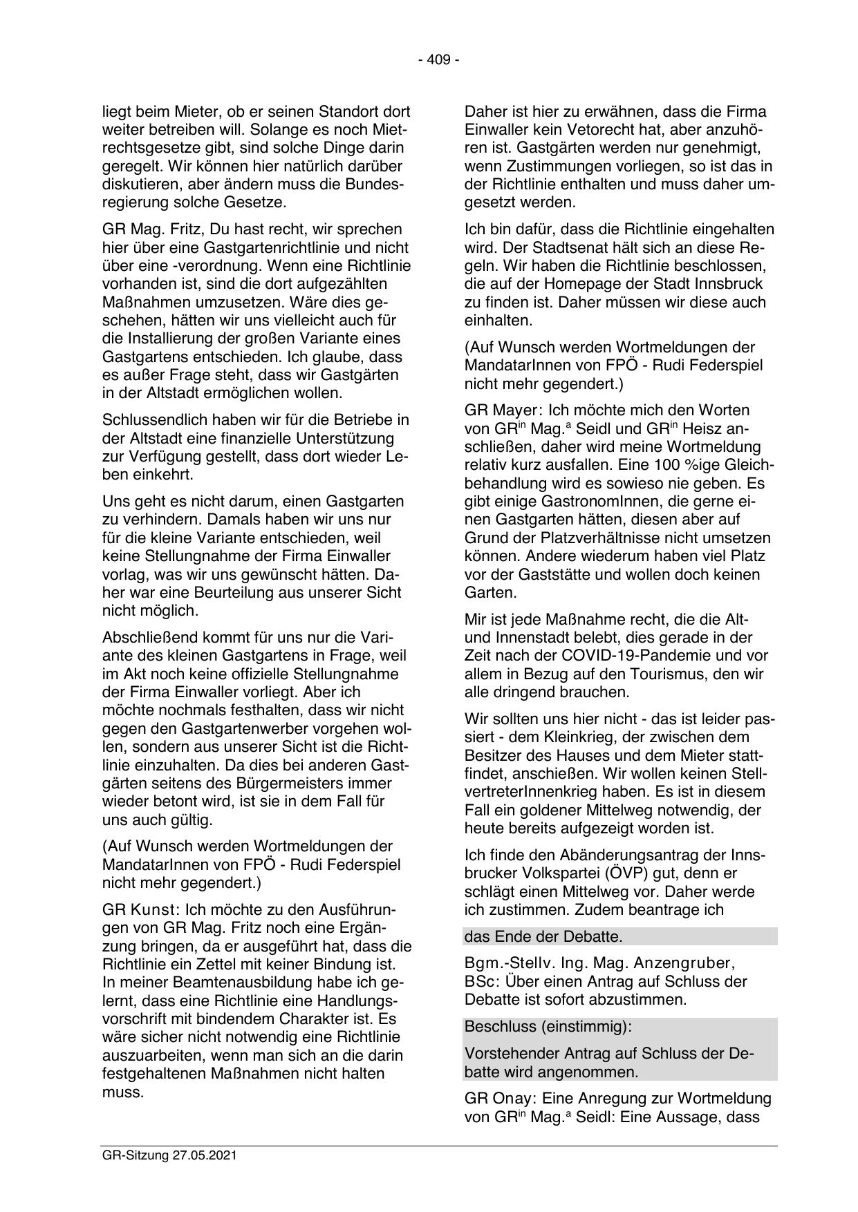 gegen den Gastgartenwerber vorgehen wollen, sondern aus unserer Sicht ist die Richtlinie einzuhalten. Da dies bei anderen Gastgärten seitens des Bürgermeisters immer