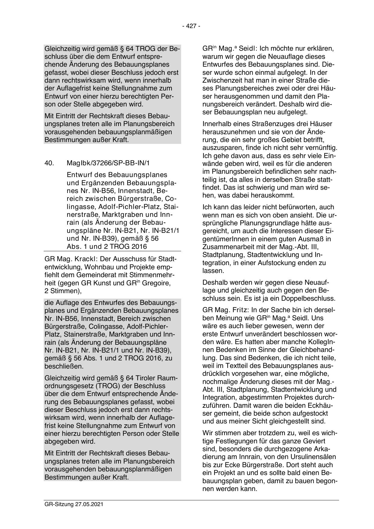 und Ergänzenden Bebauungsplanes Nr. IN-B56, Innenstadt, Bereich zwischen Bürgerstraße, Colingasse, Adolf-Pichler-Platz, Stainerstraße, Marktgraben und Innrain (als Änderung der Bebauungspläne Nr. IN-B21, Nr. IN-B21/1