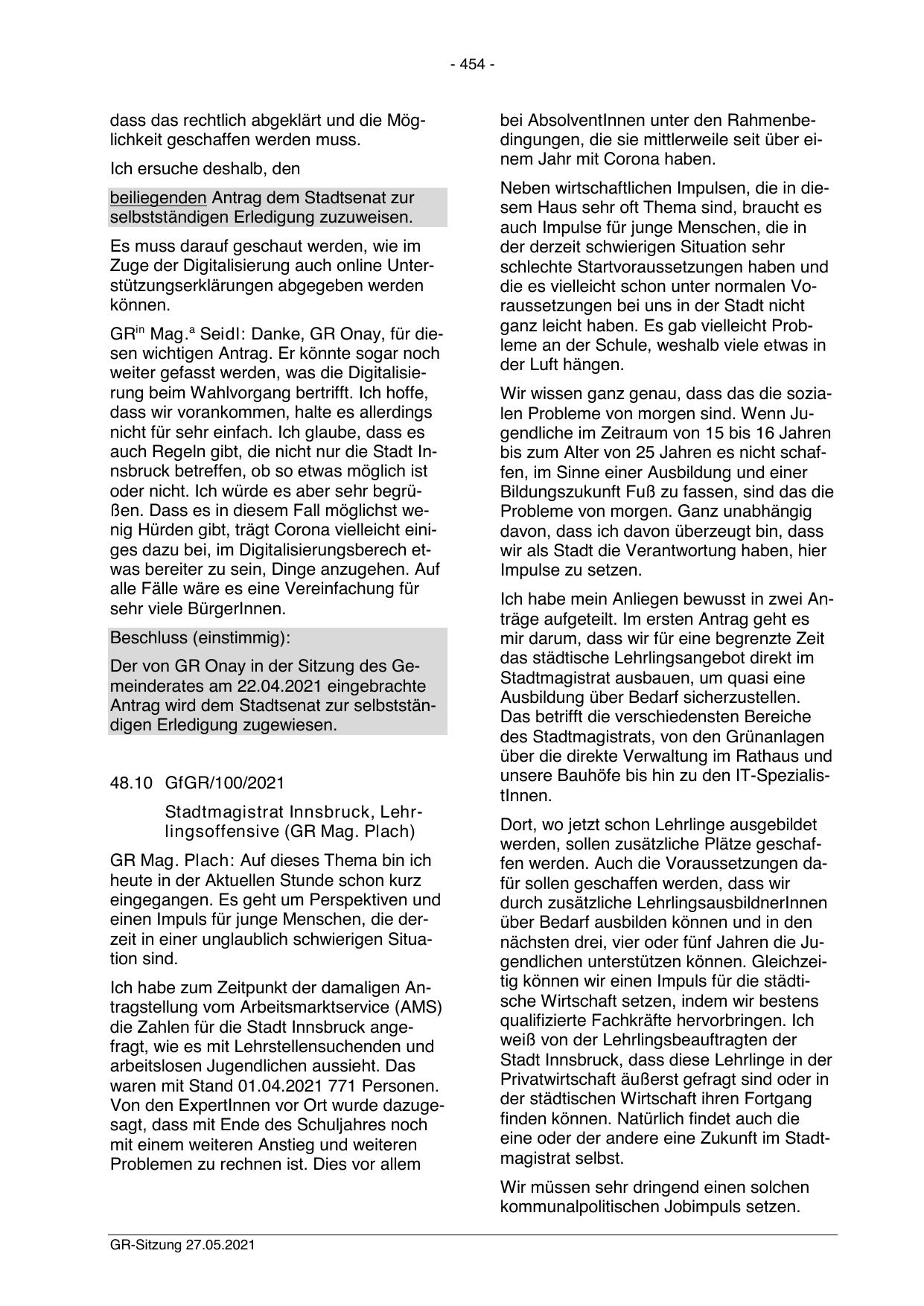 Stadtmagistrat Innsbruck, Lehrlingsoffensive (GR Mag. Plach)