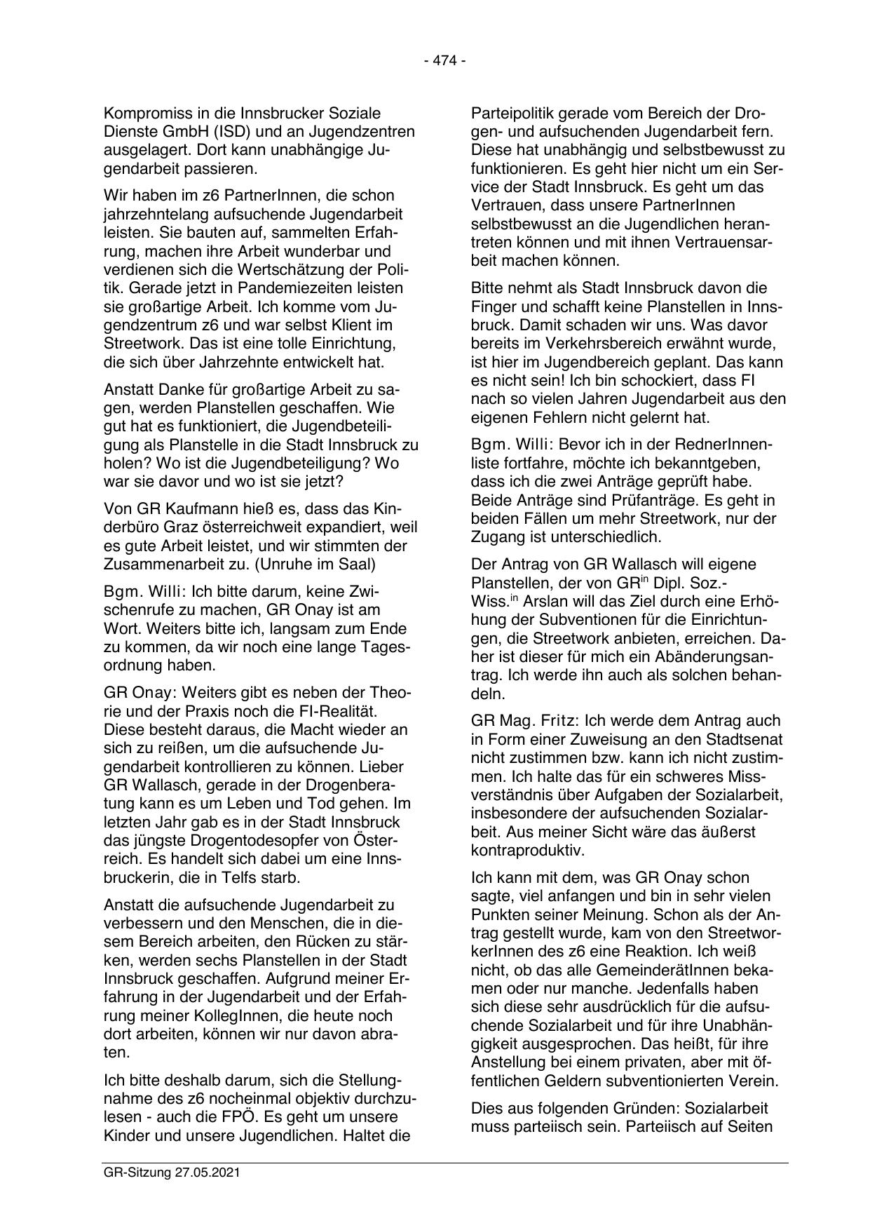 Punkten seiner Meinung. Schon als der Antrag gestellt wurde, kam von den StreetworkerInnen des z6 eine Reaktion. Ich weiß