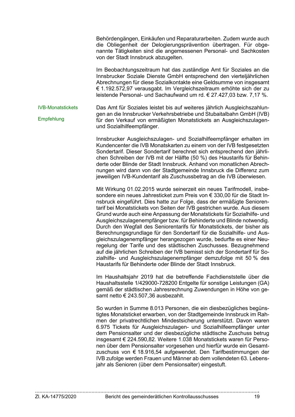 Das Amt für Soziales leistet bis auf weiteres jährlich Ausgleichszahlungen an die Innsbrucker Verkehrsbetriebe und Stubaitalbahn GmbH (IVB)