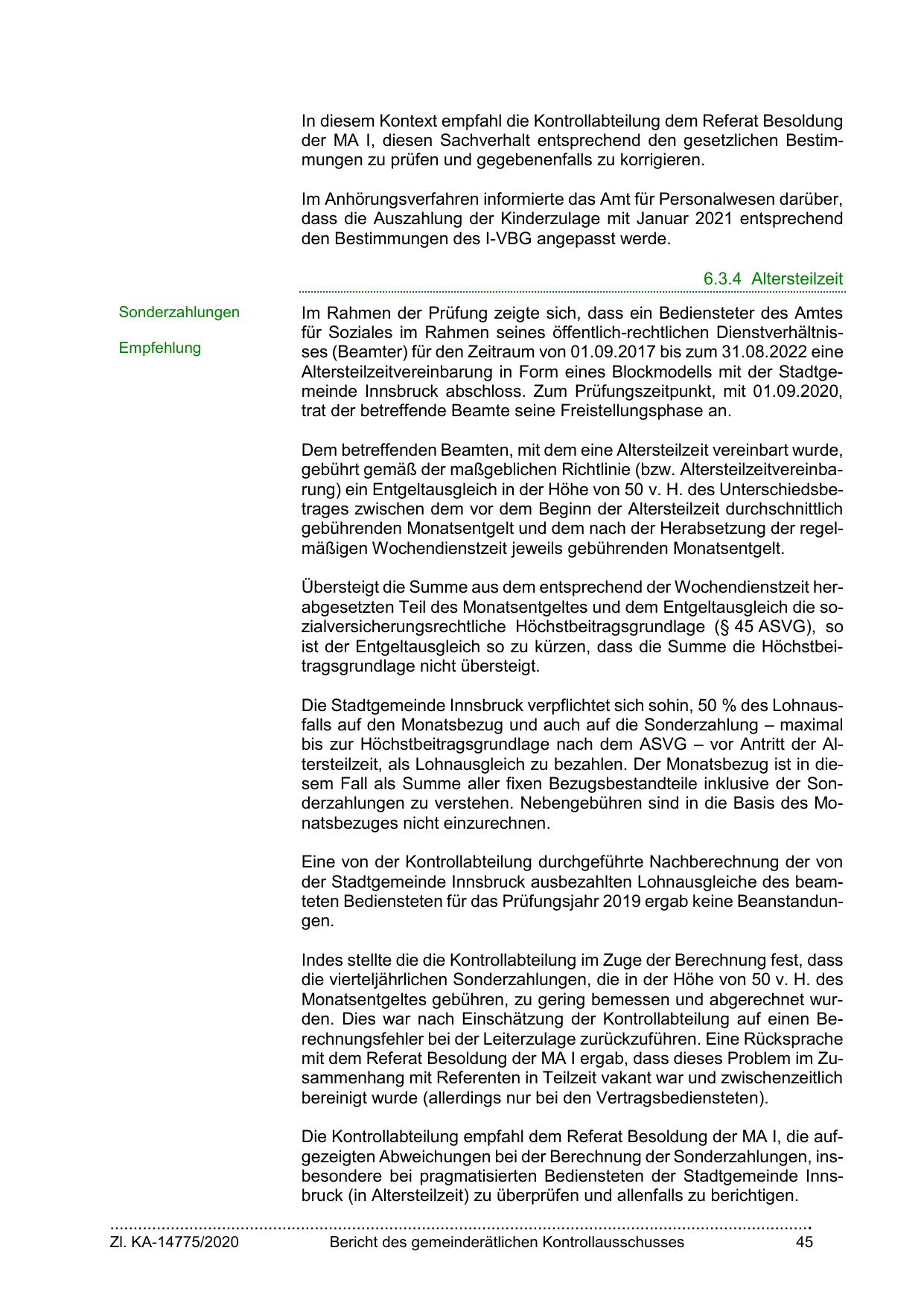 Die Kontrollabteilung empfahl dem Referat Besoldung der MA I, die aufgezeigten Abweichungen bei der Berechnung der Sonderzahlungen, insbesondere bei pragmatisierten Bediensteten der Stadtgemeinde Innsbruck (in Altersteilzeit) zu überprüfen und allenfalls zu berichtigen.