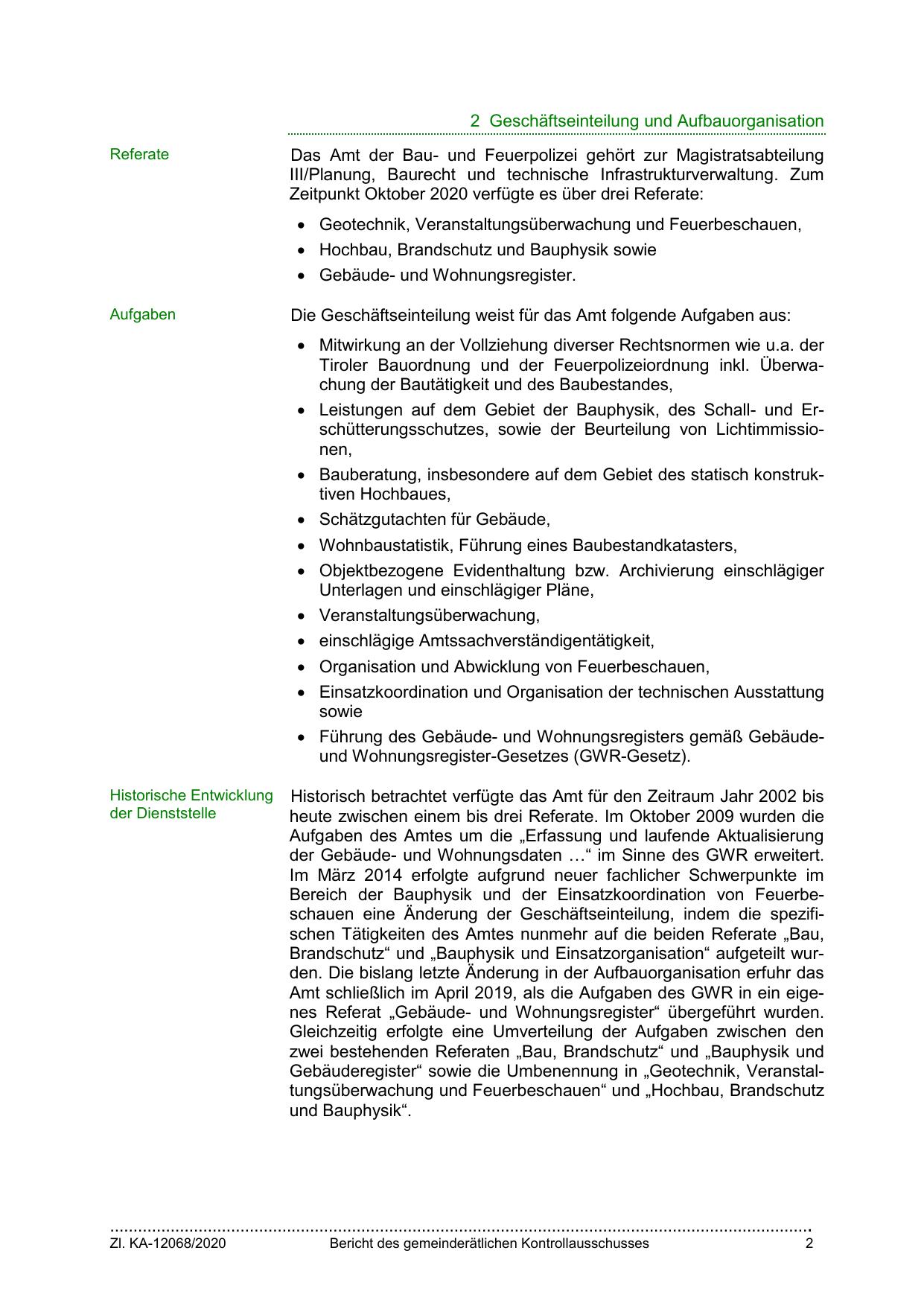 Bereich der Bauphysik und der Einsatzkoordination von Feuerbeschauen eine Änderung der Geschäftseinteilung, indem die spezifischen Tätigkeiten des Amtes nunmehr auf die beiden Referate „Bau,