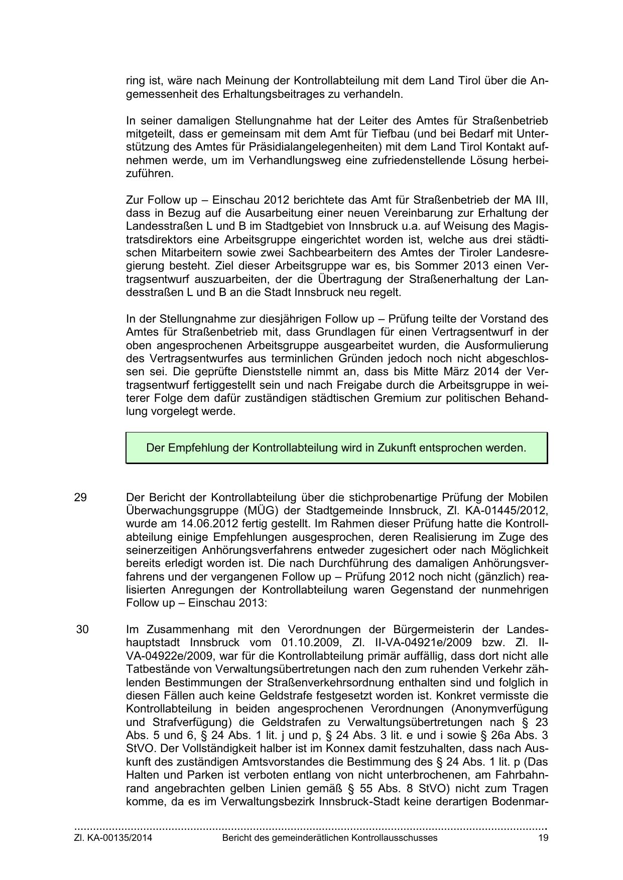 mitgeteilt, dass er gemeinsam mit dem Amt für Tiefbau (und bei Bedarf mit Unterstützung des Amtes für Präsidialangelegenheiten) mit dem Land Tirol Kontakt aufnehmen werde, um im Verhandlungsweg eine zufriedenstellende Lösung herbeizuführen.