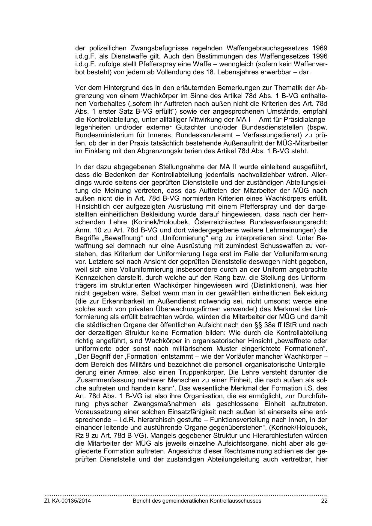 Hinsichtlich der aufgezeigten Ausrüstung mit einem Pfefferspray und der dargestellten einheitlichen Bekleidung wurde darauf hingewiesen, dass nach der herrschenden Lehre (Korinek/Holoubek, Österreichisches Bundesverfassungsrecht: