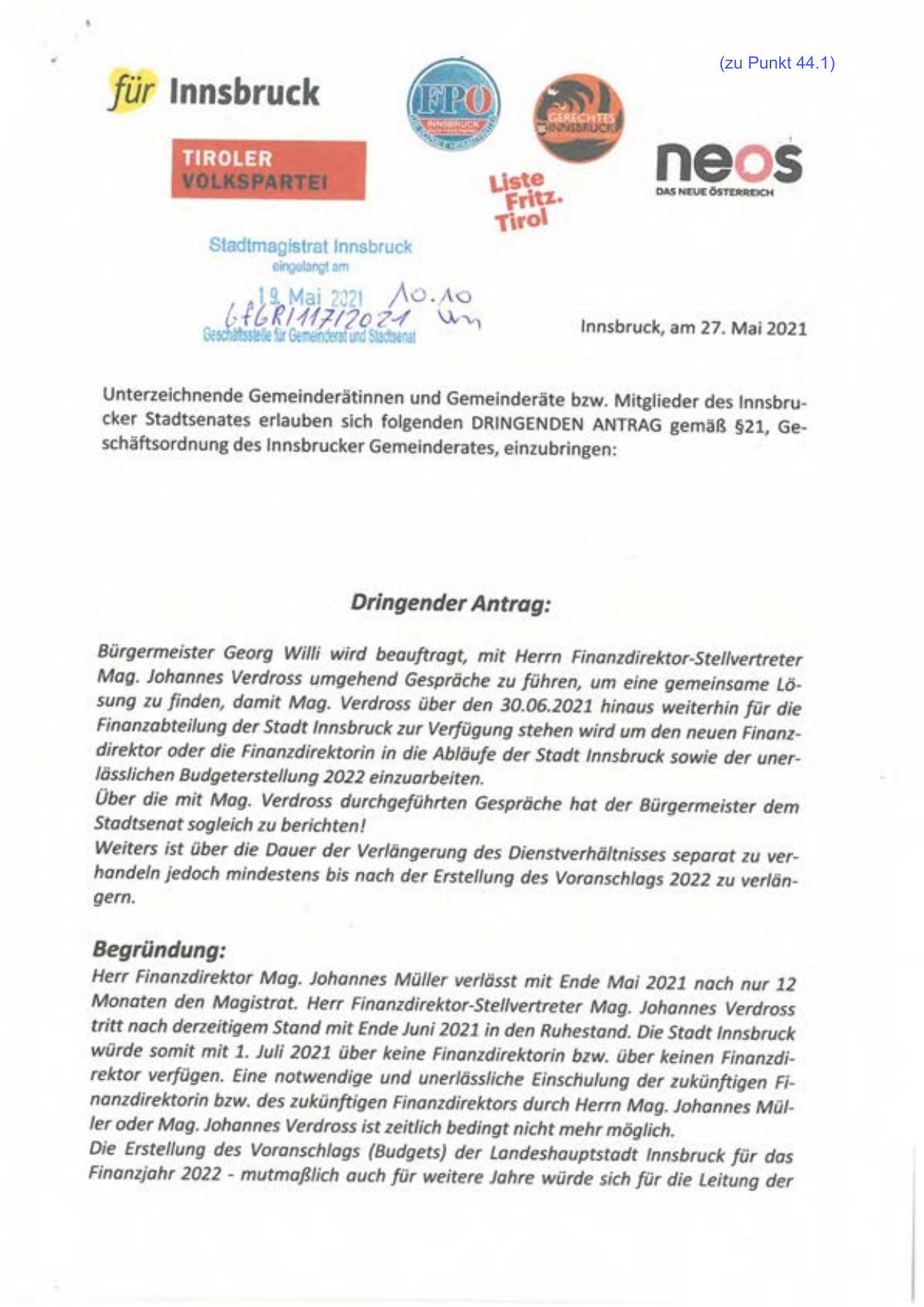Unterzeichnende Gemeind erätinne n und Gemeinderäte bzw. Mitglied er des lnnsbrucker Stadtsenates erlauben sich folgenden DRINGENDEN ANTRAG gemäß §21, Geschäftsordnung des lnnsbruc ker Gemeinderates, einzubringen: