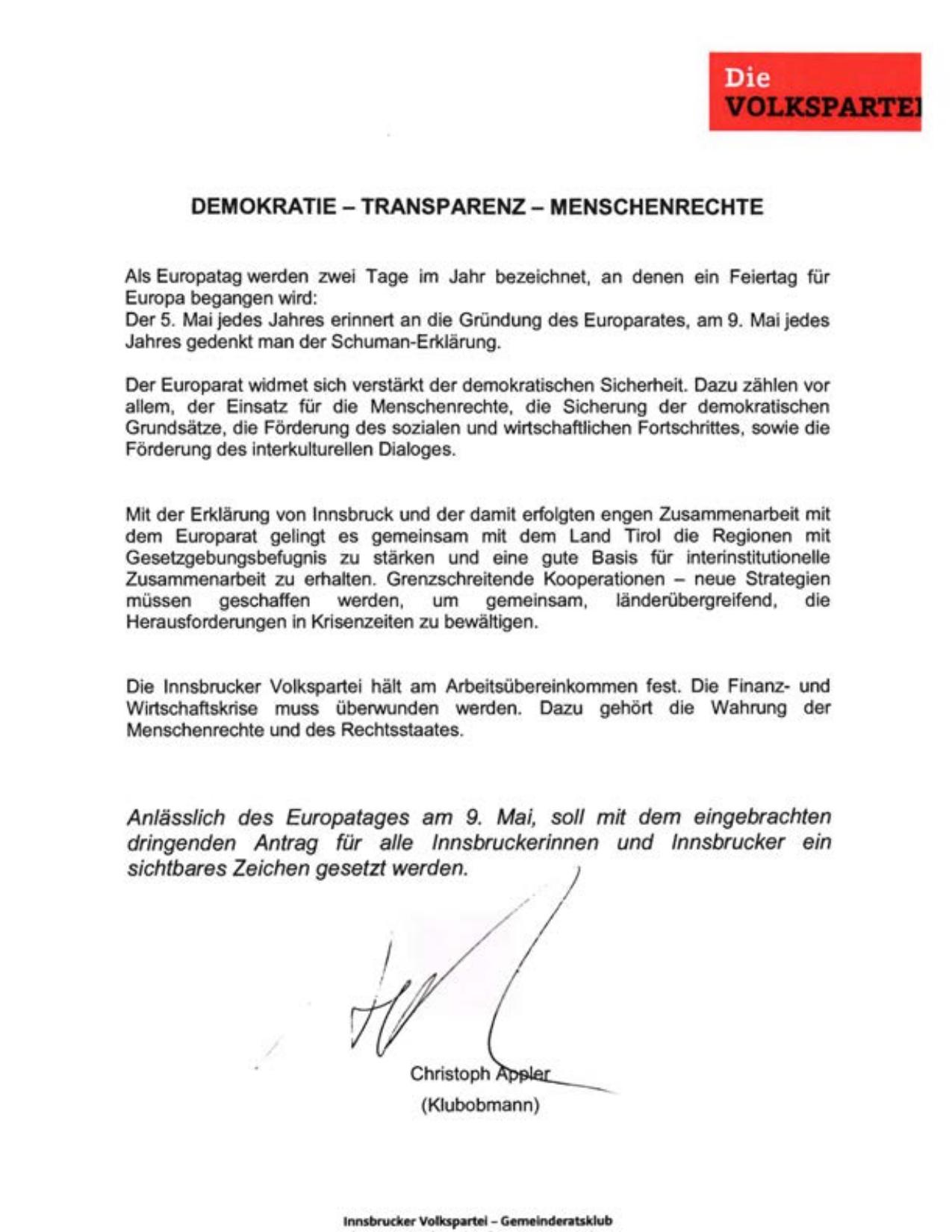 Anlässlich des Europatages am 9. Mai, soll mit dem eingebrachten