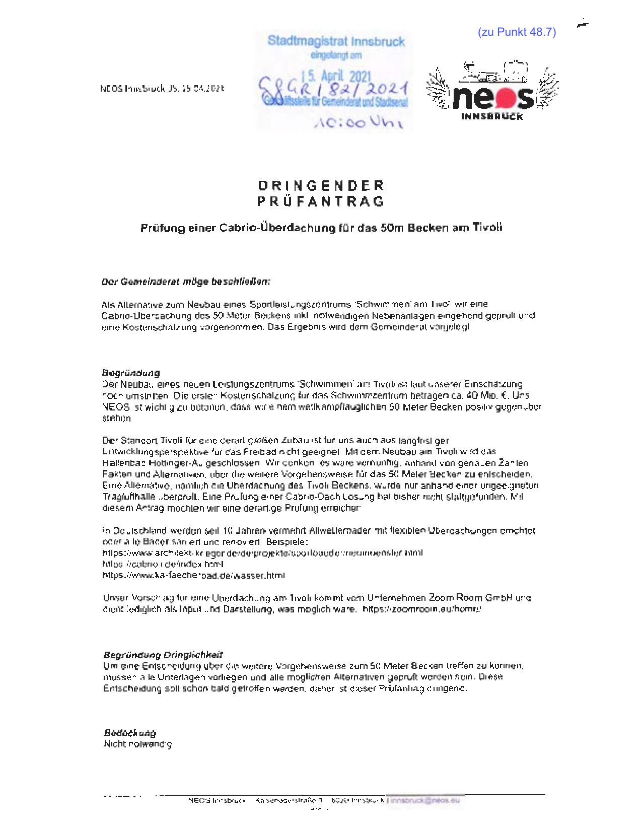 NEOS ist wichtig zu betonen, dass wir einem wettkampftauglichen 50 Meter Becken positiv gegenüber