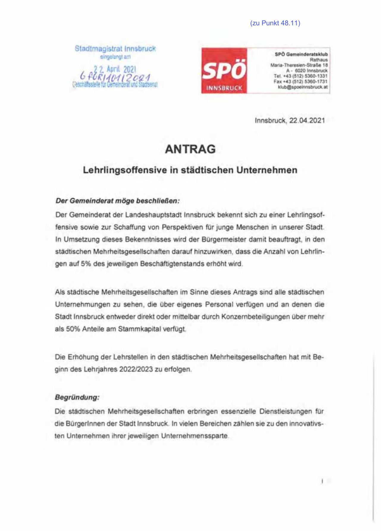 Der Gemeinderat der Landeshauptstadt Innsbruck bekennt sich zu einer Lehrlingsoffensive sowie zur Schaffung von Perspektiven für junge Menschen in unserer Stadt.