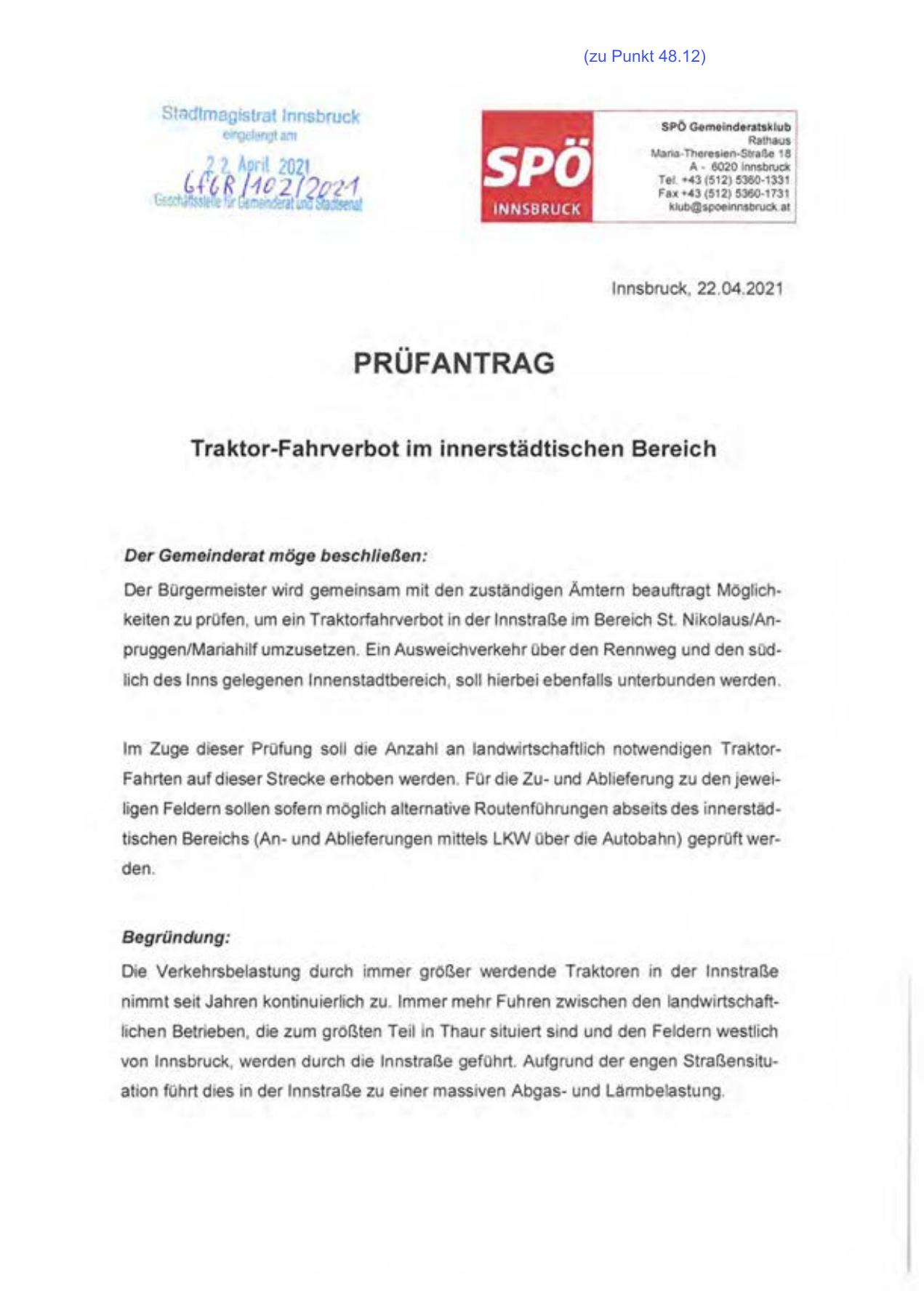 Der Bürgermeister wird gemeinsam mit den zuständigen Ämtern beauftragt Möglichkeiten zu prüfen, um ein Traktorfahrverbot in der tnnstraße im Bereich St. Nikolaus/Anpruggen/Mariah ilf umzusetzen. Ein Ausweichverkehr über den Rennweg und den südlich des lnns gelegenen Innenstadtbereich, soll hierbei ebenfalls unterbunden werden .
