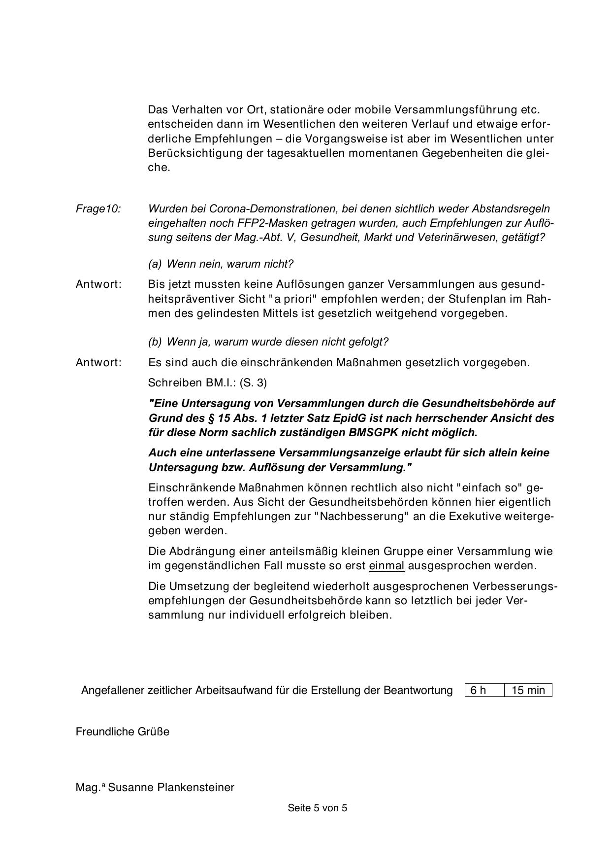 eingehalten noch FFP2-Masken getragen wurden, auch Empfehlungen zur Auflösung seitens der Mag.-Abt. V, Gesundheit, Markt und Veterinärwesen, getätigt?