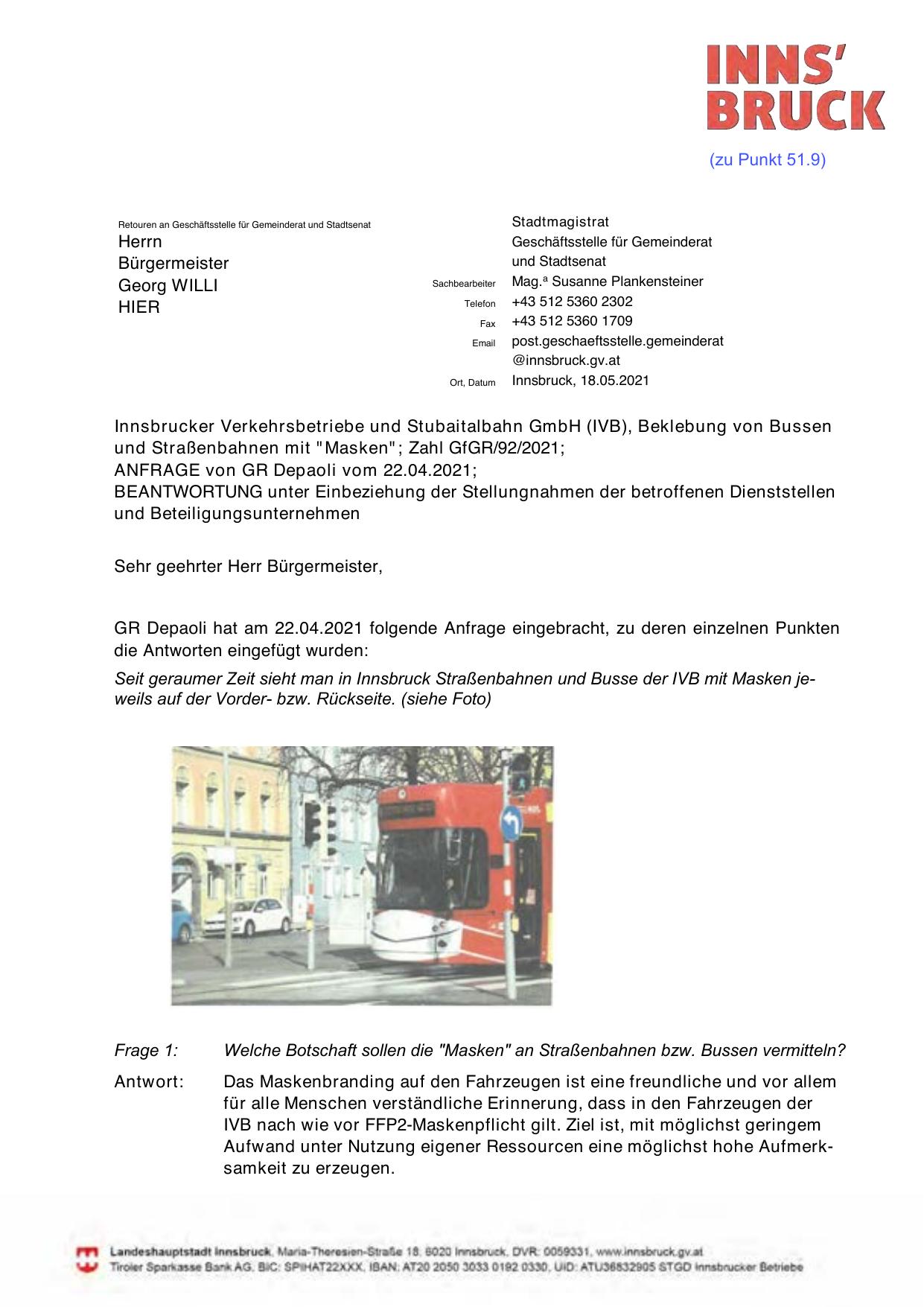 und Straßenbahnen mit "Masken"; Zahl GfGR/92/2021;