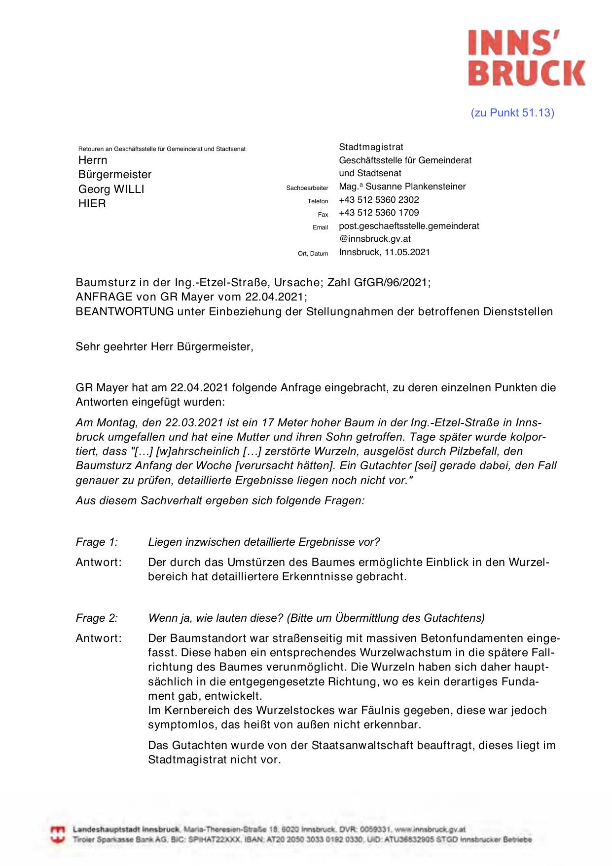 GR Mayer hat am 22.04.2021 folgende Anfrage eingebracht, zu deren einzelnen Punkten die