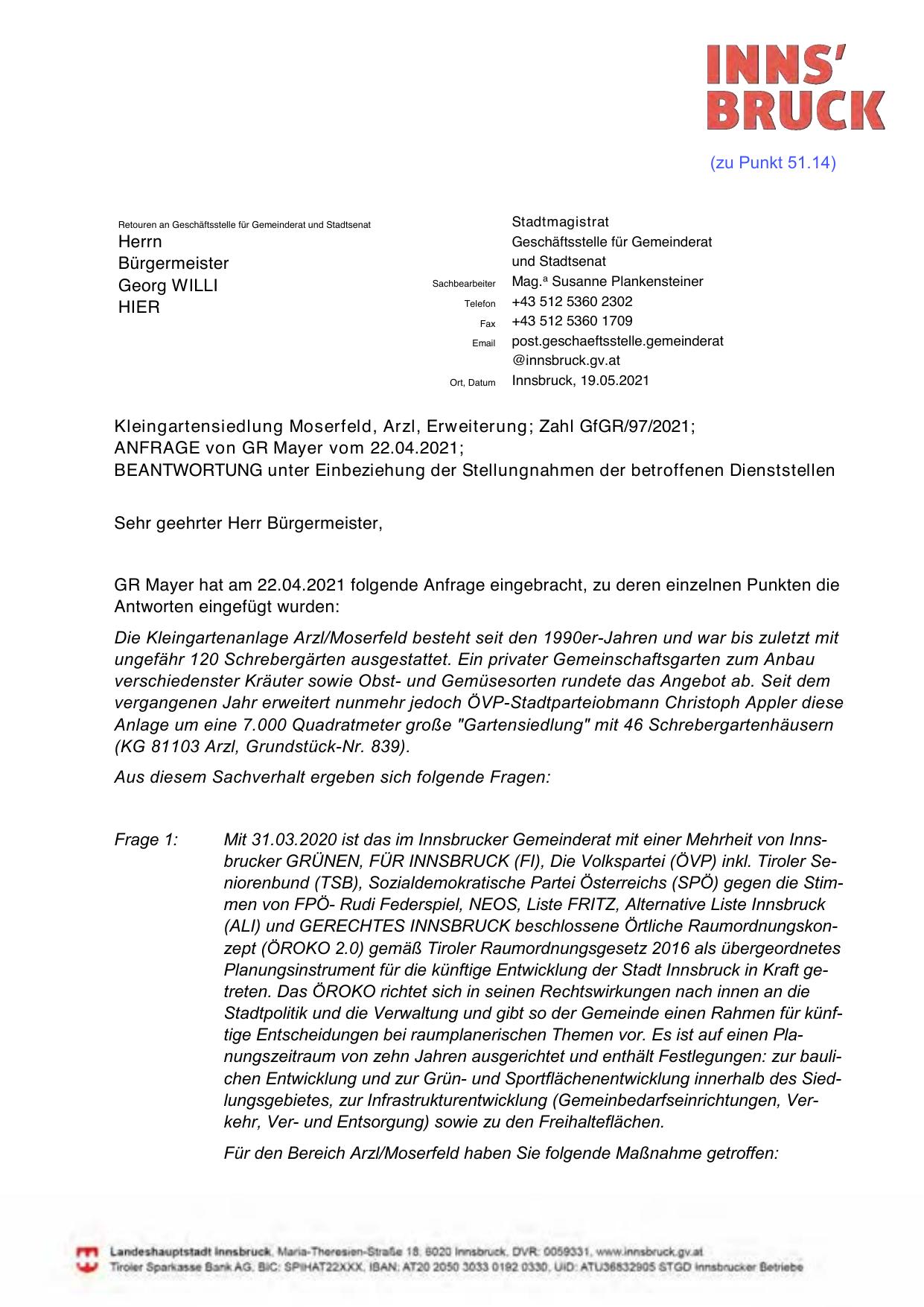 GR Mayer hat am 22.04.2021 folgende Anfrage eingebracht, zu deren einzelnen Punkten die