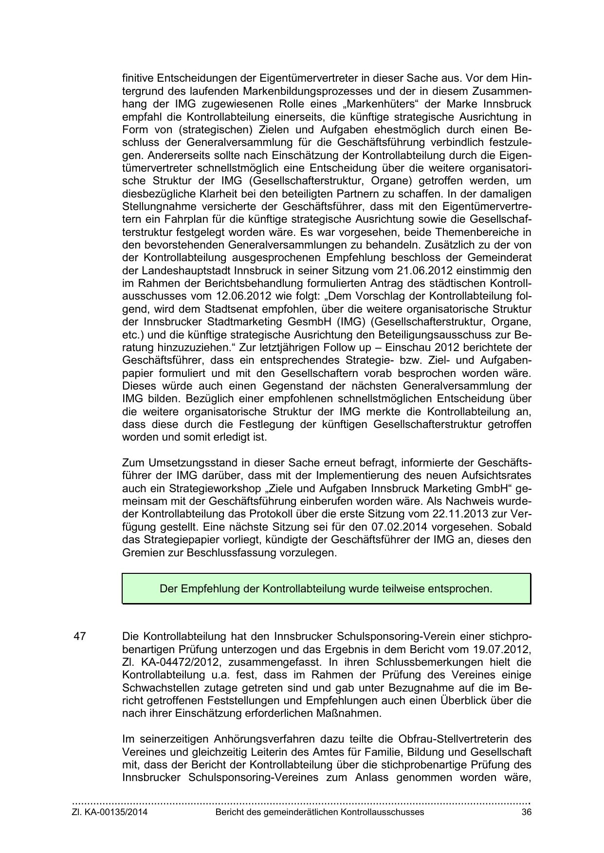 auch ein Strategieworkshop „Ziele und Aufgaben Innsbruck Marketing GmbH“ gemeinsam mit der Geschäftsführung einberufen worden wäre. Als Nachweis wurdeder Kontrollabteilung das Protokoll über die erste Sitzung vom 22.11.2013 zur Verfügung gestellt. Eine nächste Sitzung sei für den 07.02.2014 vorgesehen. Sobald
