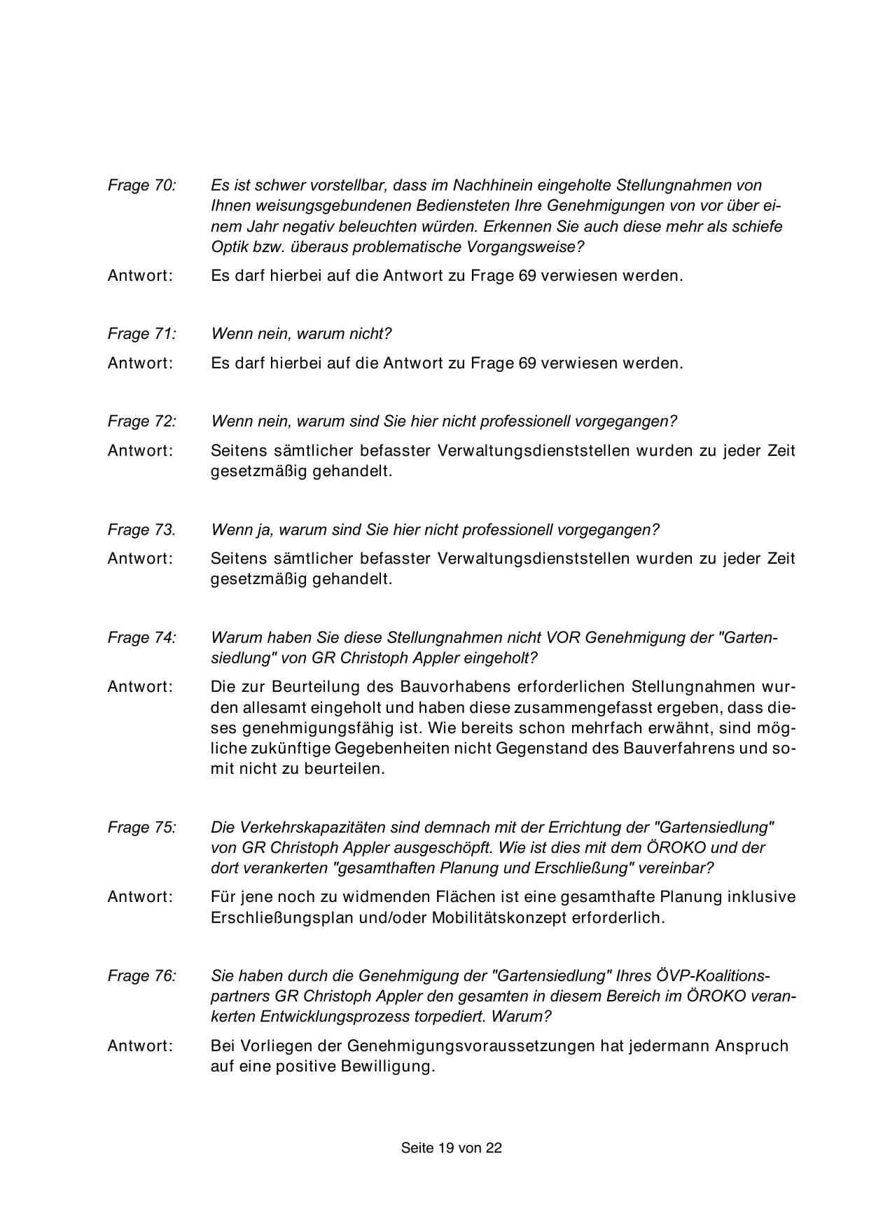 Sie haben durch die Genehmigung der "Gartensiedlung" Ihres ÖVP-Koalitionspartners GR Christoph Appler den gesamten in diesem Bereich im ÖROKO verankerten Entwicklungsprozess torpediert. Warum?