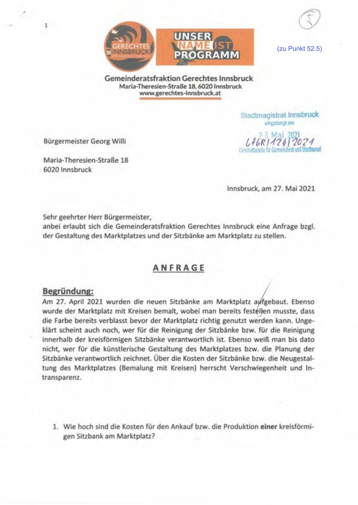 anbei erlaubt sich die Gemeinderatsfraktion Gerechtes Innsbruck eine Anfrage bzgl.