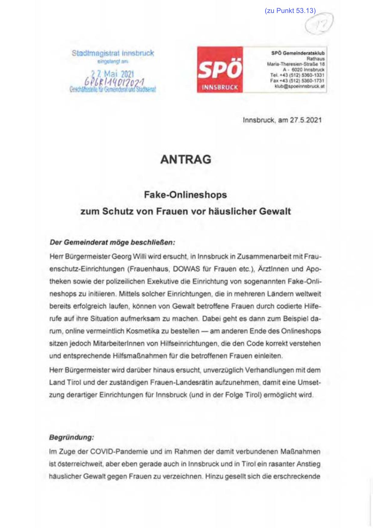 Herr Bürgermeister Georg Willi wird ersucht, in Innsbruck in Zusammenarbeit mit Frau enschutz-Einrichtungen (Frauenhaus, DOWAS für Frauen etc.), Ärztinnen und Apotheken sowie der polizeilichen Exekutive die Einrichtung von sogenannten Fake-Onlineshops zu initiieren . Mittels solcher Einrichtungen , die in mehreren Ländern weltweit