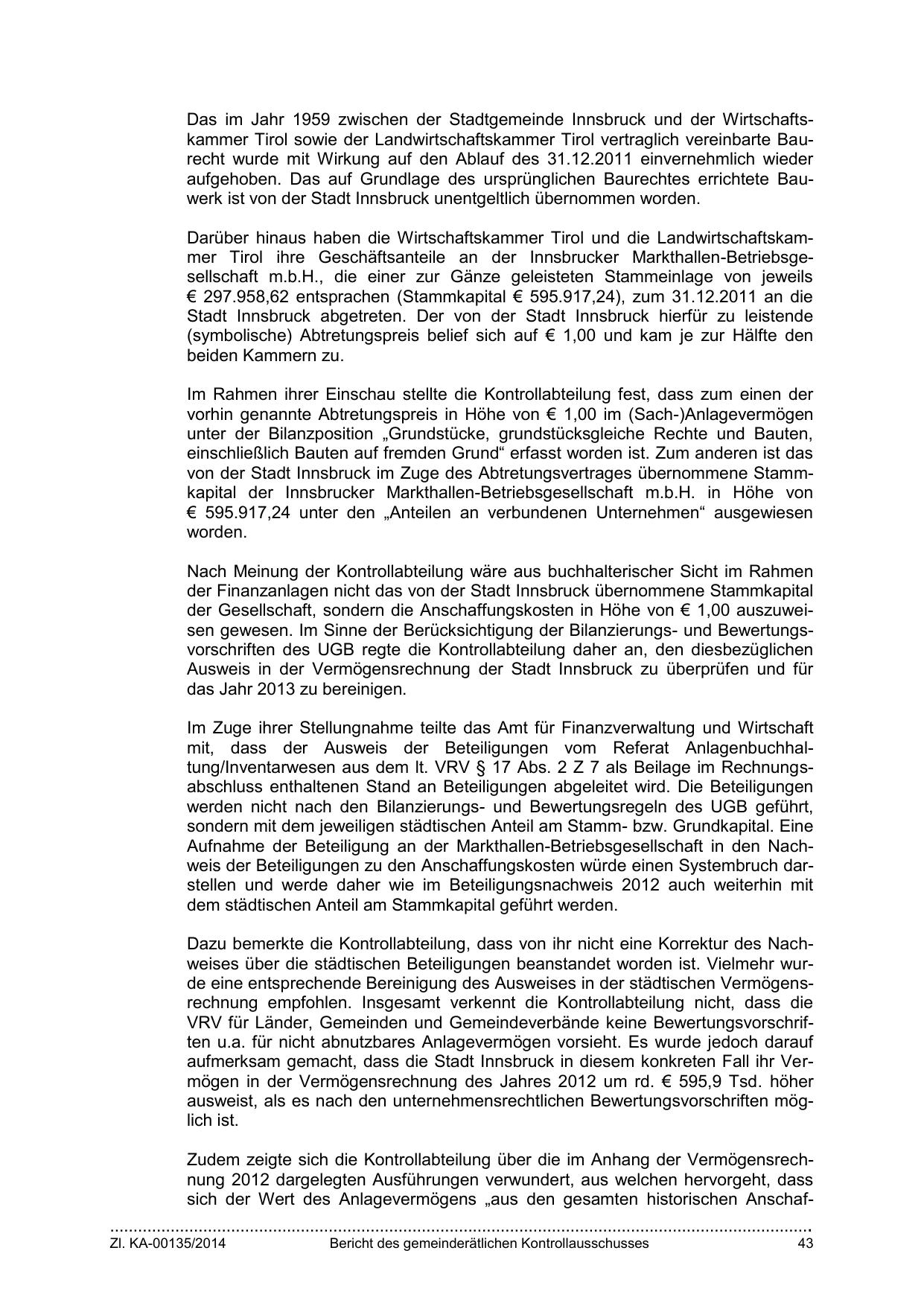 aufmerksam gemacht, dass die Stadt Innsbruck in diesem konkreten Fall ihr Vermögen in der Vermögensrechnung des Jahres 2012 um rd. € 595,9 Tsd. höher