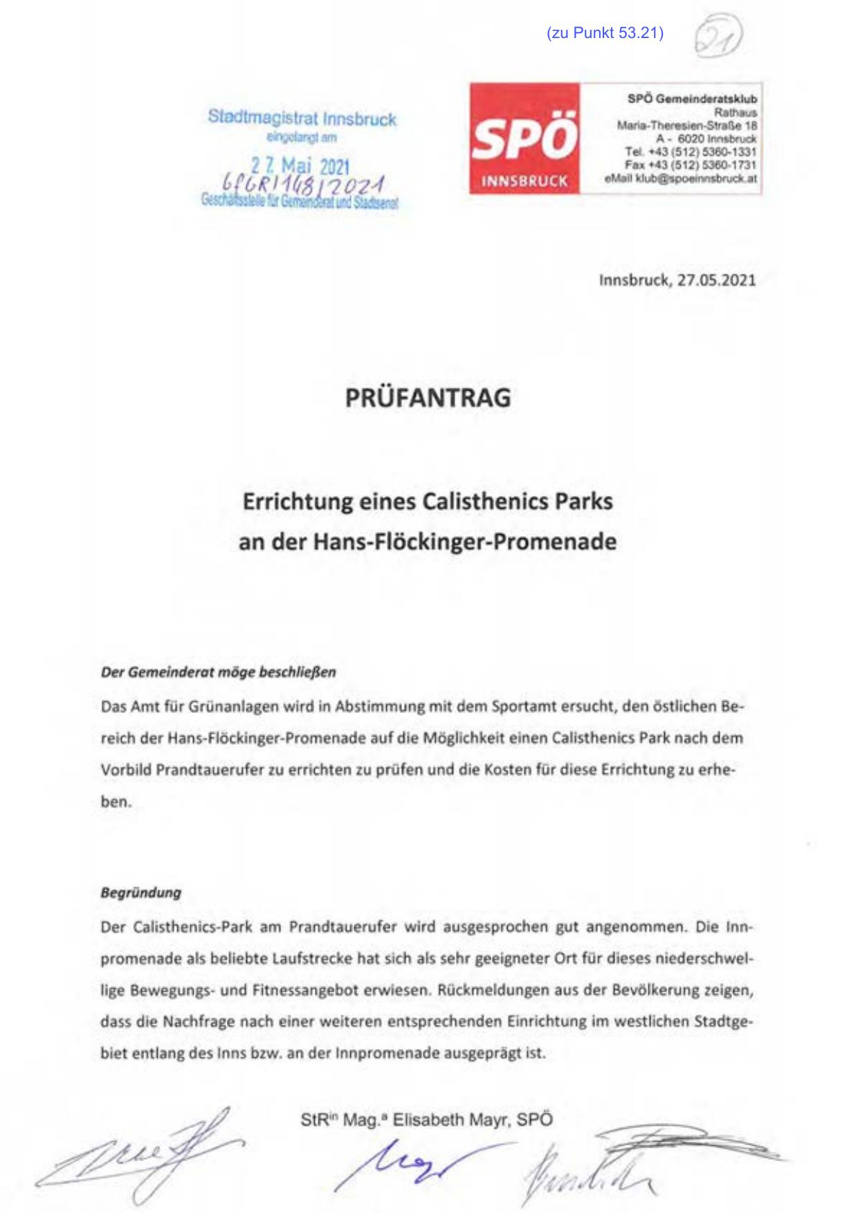 Das Amt für Grünanlagen wird in Abstimmung mit dem Sportamt ersucht, den östlichen Bereich der Hans-Flöckinger-Promenade auf die Möglichkeit einen Calisthenics Park nach dem