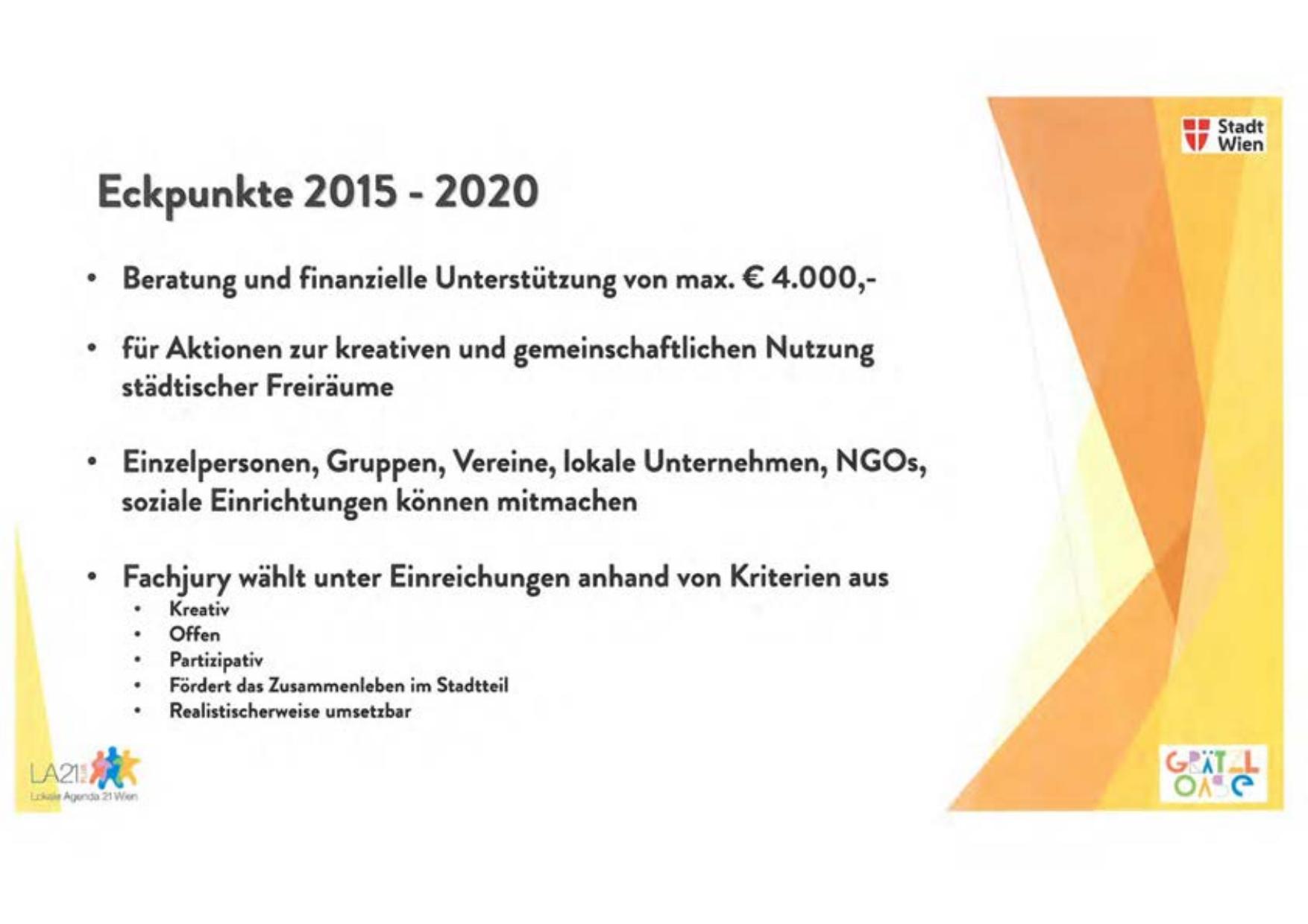 • Beratung und finanzielle Unterstützung von max. € 4.000,• für Aktionen zur kreativen und gemeinschaftlichen Nutzung