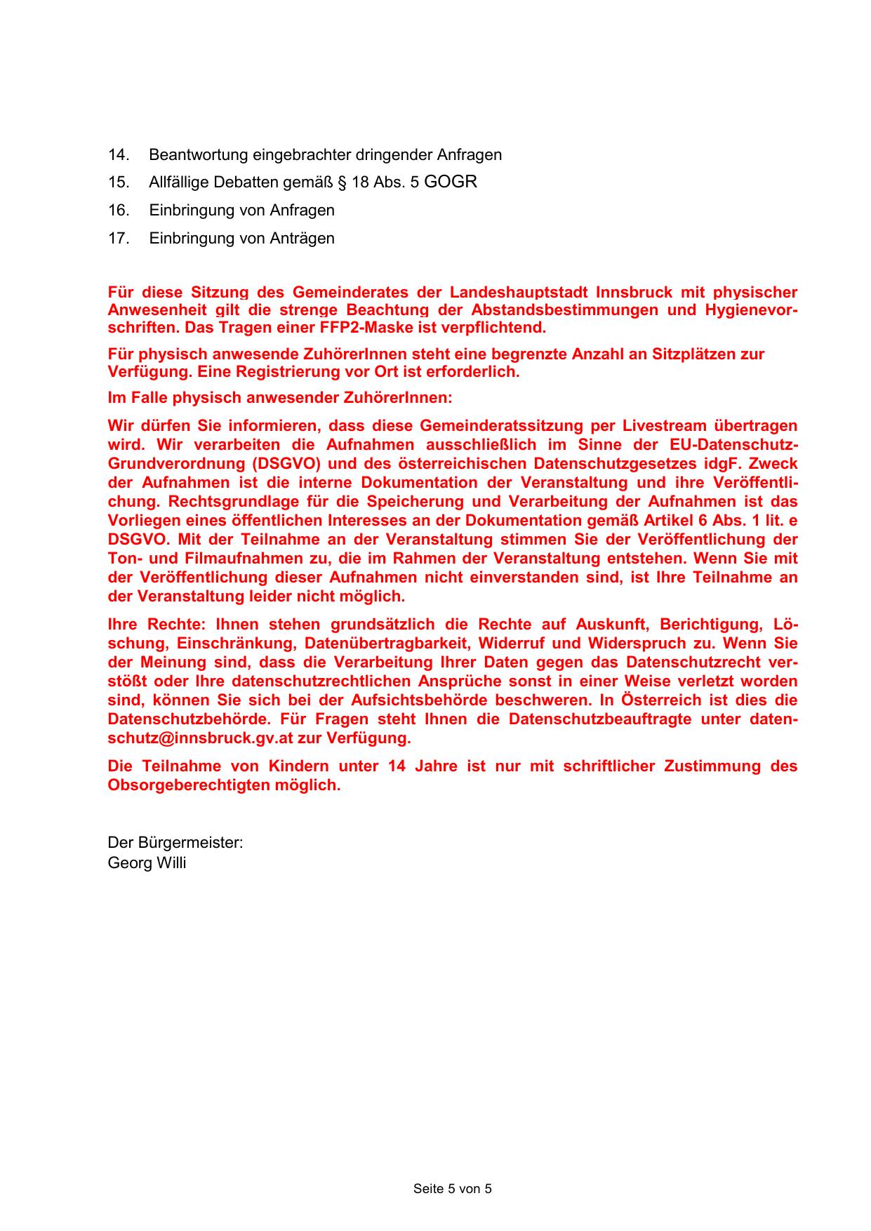 Für diese Sitzung des Gemeinderates der Landeshauptstadt Innsbruck mit physischer