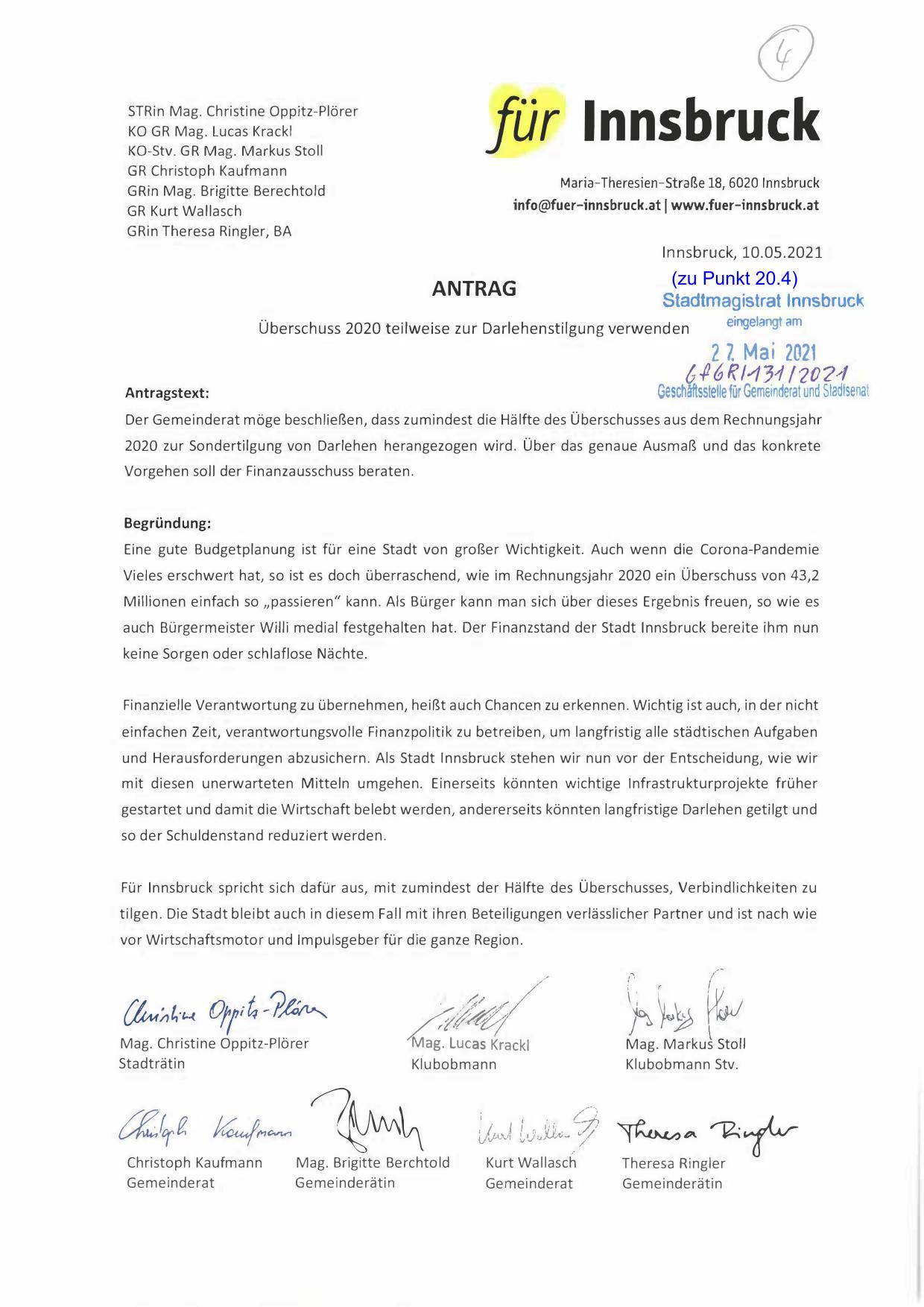 Für Innsbruck spricht sich dafür aus, mit zumindest der Hälfte des Überschusses, Verbindlichkeiten zu