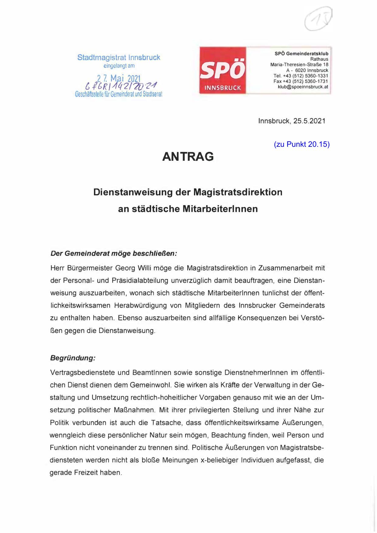 Herr Bürgermeister Georg Willi möge die Magistratsdirektion in Zusammenarbeit mit