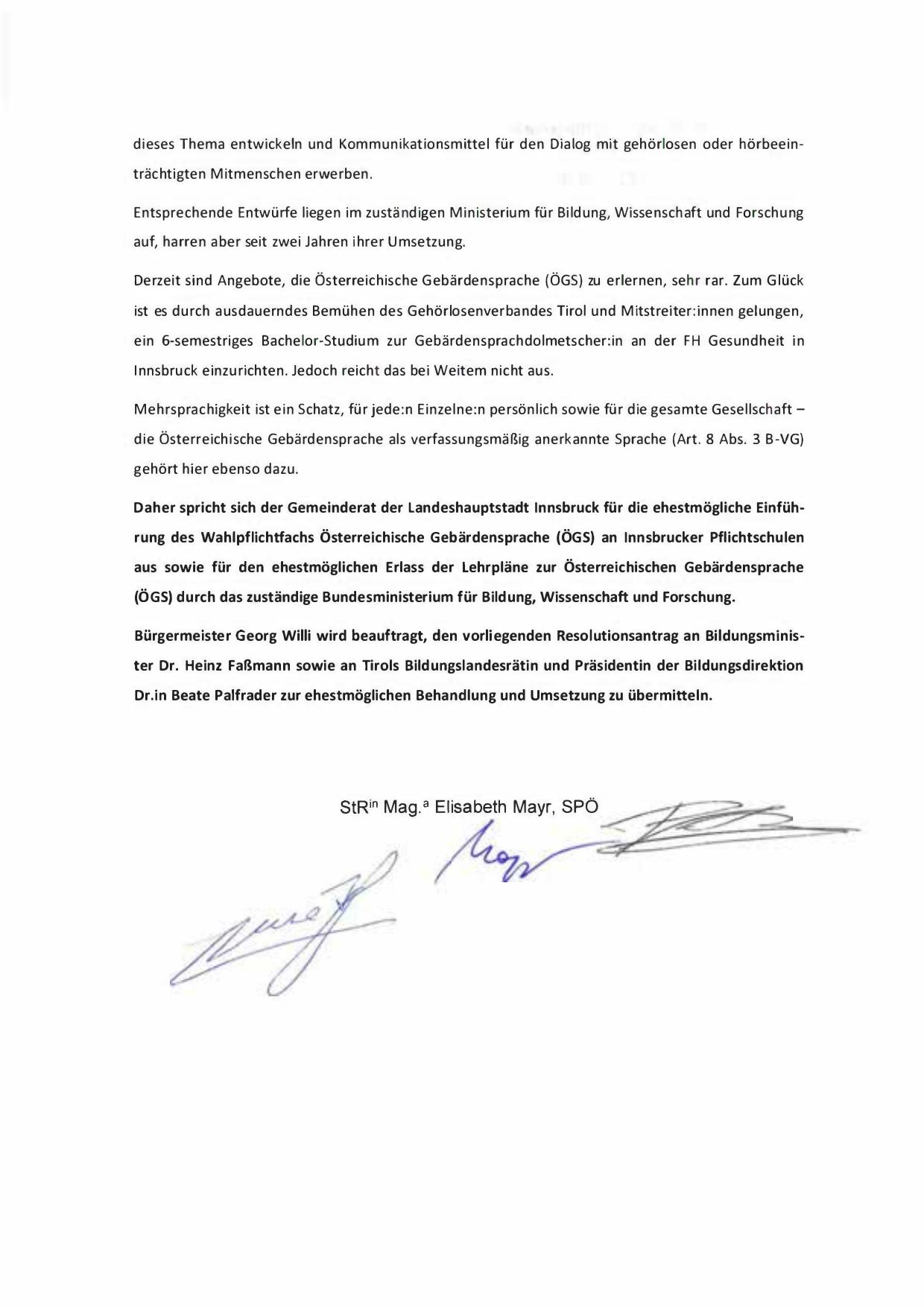Bürgermeiste r Georg Willi wird beauftragt, den vorli egenden Resol utionsantrag a n Bildungsminis