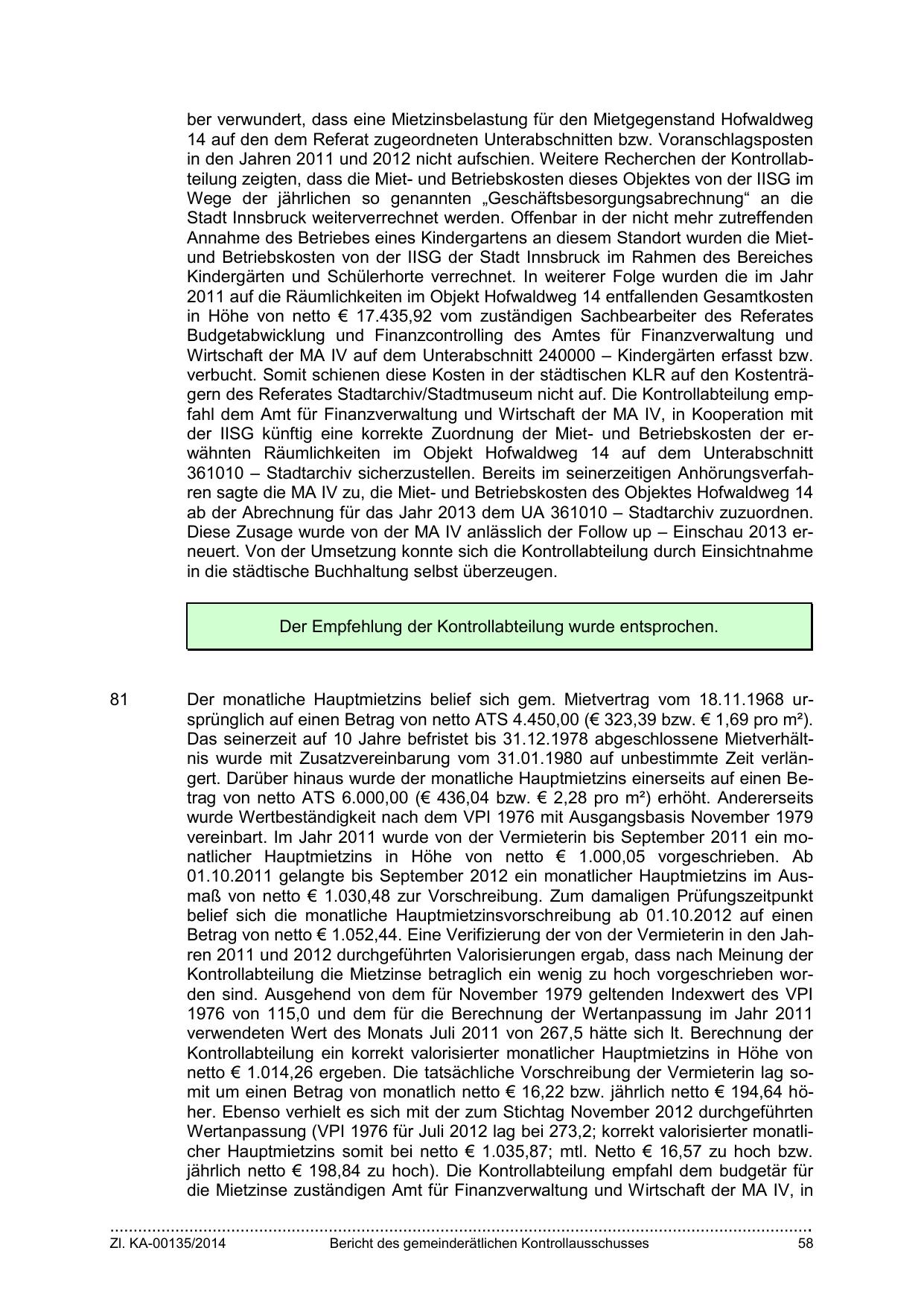 361010 – Stadtarchiv sicherzustellen. Bereits im seinerzeitigen Anhörungsverfahren sagte die MA IV zu, die Miet- und Betriebskosten des Objektes Hofwaldweg 14