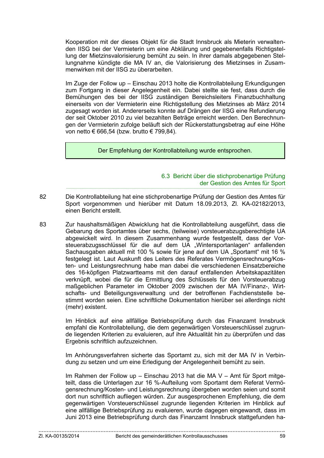 Kooperation mit der dieses Objekt für die Stadt Innsbruck als Mieterin verwaltenden IISG bei der Vermieterin um eine Abklärung und gegebenenfalls Richtigstellung der Mietzinsvalorisierung bemüht zu sein. In ihrer damals abgegebenen Stellungnahme kündigte die MA IV an, die Valorisierung des Mietzinses in Zusammenwirken mit der IISG zu überarbeiten.