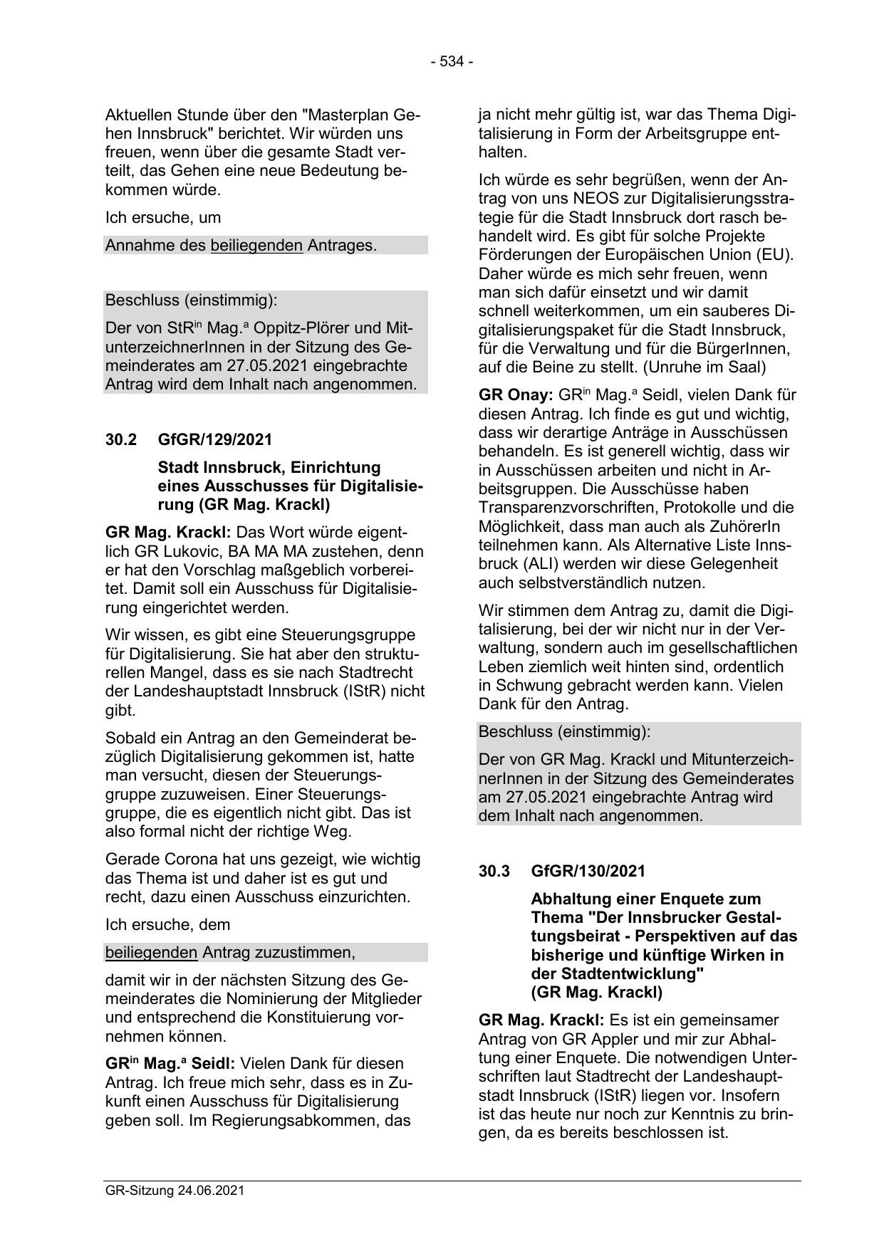 Der von StRin Mag.a Oppitz-Plörer und MitunterzeichnerInnen in der Sitzung des Gemeinderates am 27.05.2021 eingebrachte
