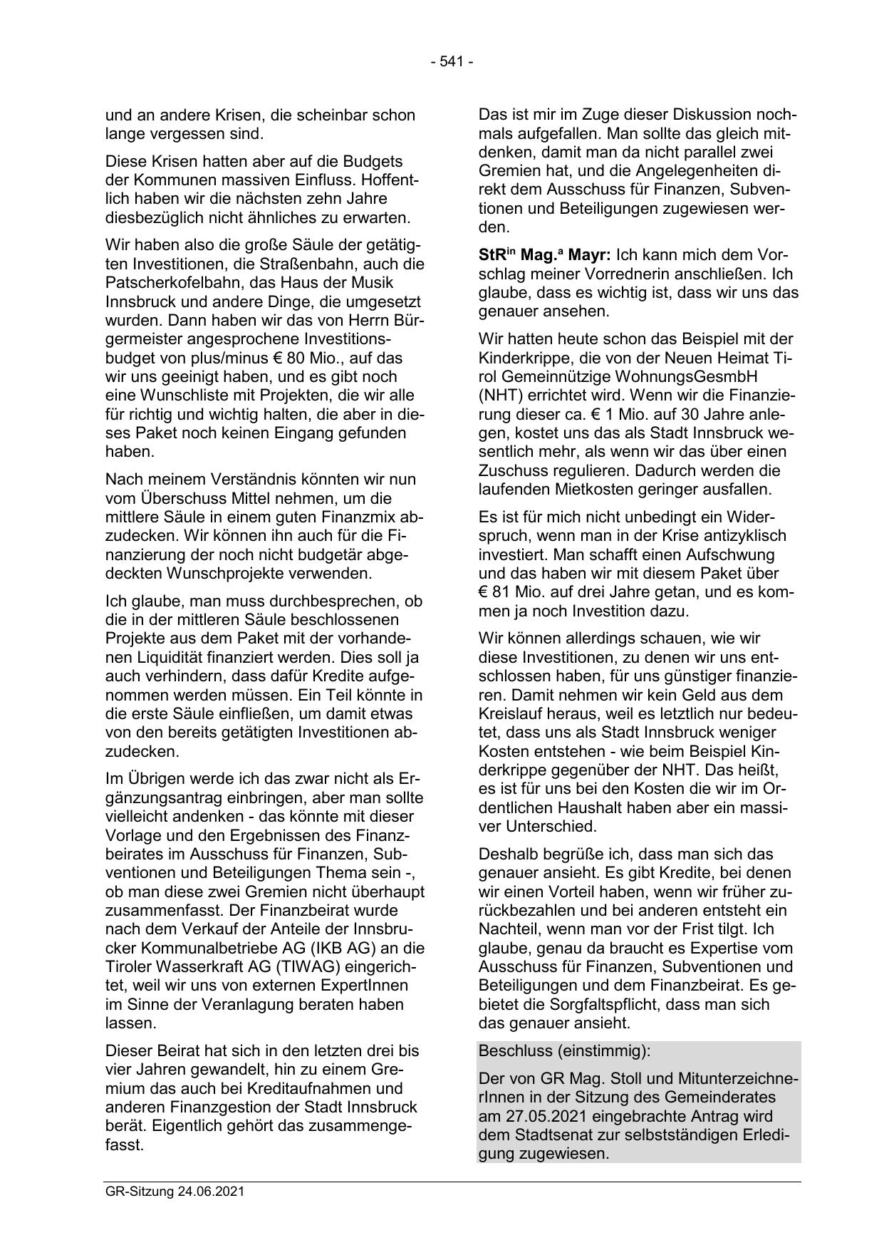 (NHT) errichtet wird. Wenn wir die Finanzierung dieser ca. € 1 Mio. auf 30 Jahre anlegen, kostet uns das als Stadt Innsbruck wesentlich mehr, als wenn wir das über einen