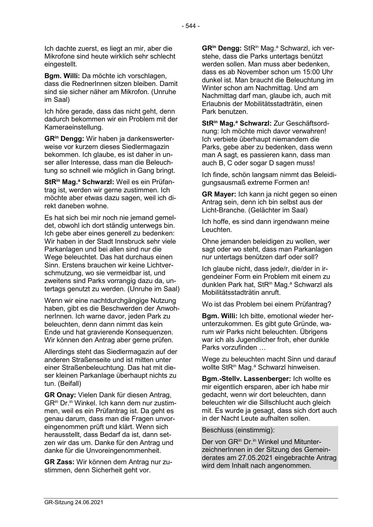 Bgm. Willi: Ich bitte, emotional wieder herunterzukommen. Es gibt gute Gründe, warum wir Parks nicht beleuchten. Übrigens
