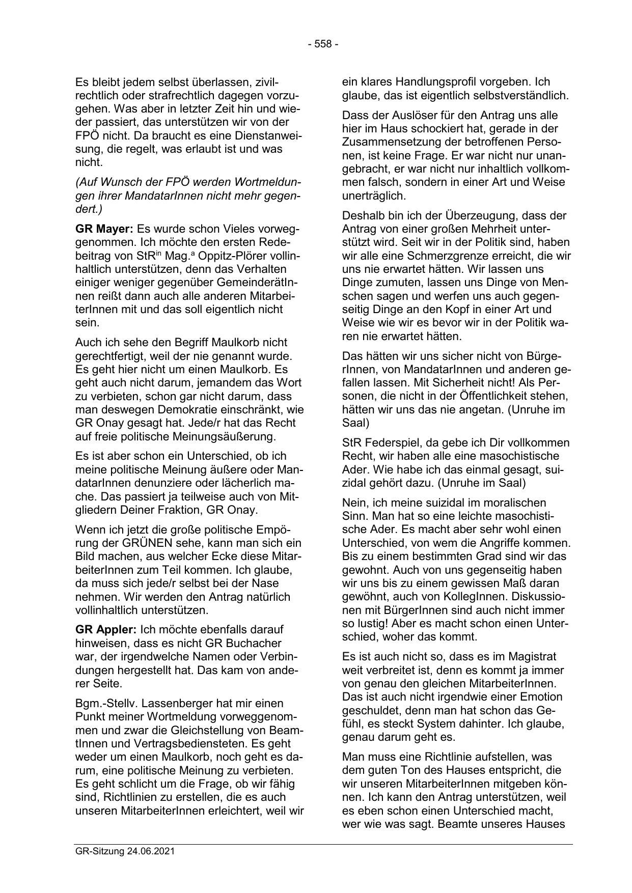 (Auf Wunsch der FPÖ werden Wortmeldungen ihrer MandatarInnen nicht mehr gegendert.)
