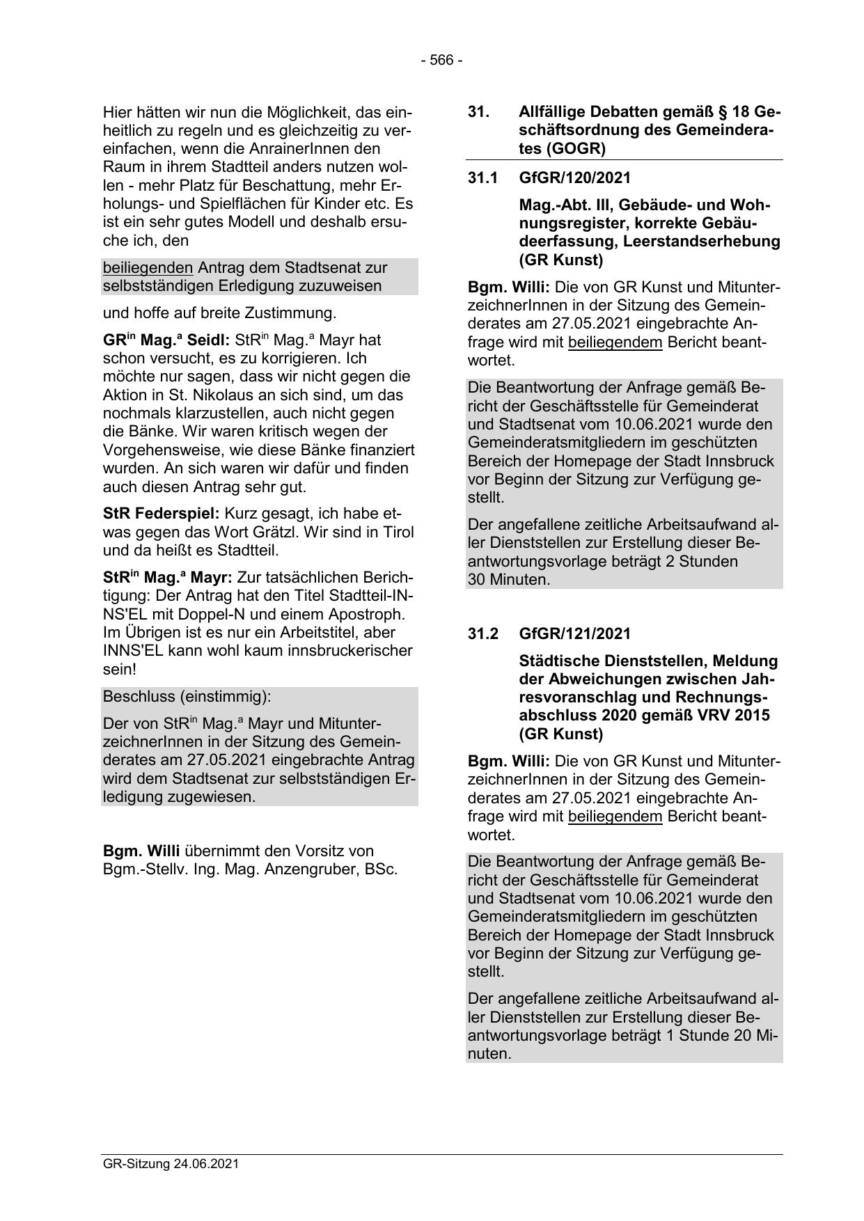 Bgm. Willi: Die von GR Kunst und MitunterzeichnerInnen in der Sitzung des Gemeinderates am 27.05.2021 eingebrachte Anfrage wird mit beiliegendem Bericht beantwortet.
