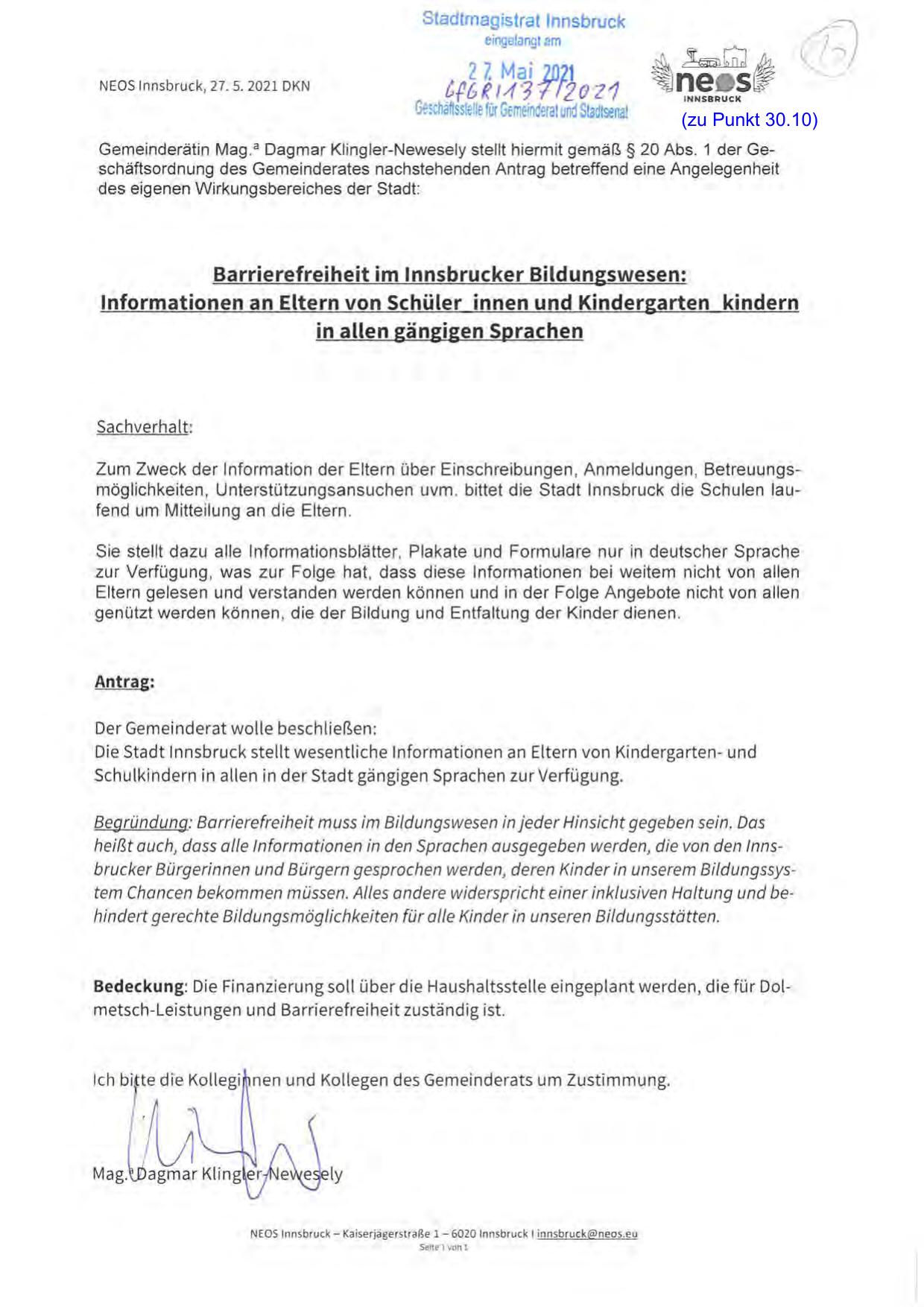 heißt auch, dass alle Informationen in den Sprachen ausgegeben werden, die von den lnnsbrucker Bürgerinnen und Bürgern gesprochen werden, deren Kinder in unserem Bildungssystem Chancen bekommen müssen. Alles andere widerspricht einer inklusiven Haltung und behindert gerechte Bildungsmöglichkeiten für alle Kinder in unseren Bildungsstätten.