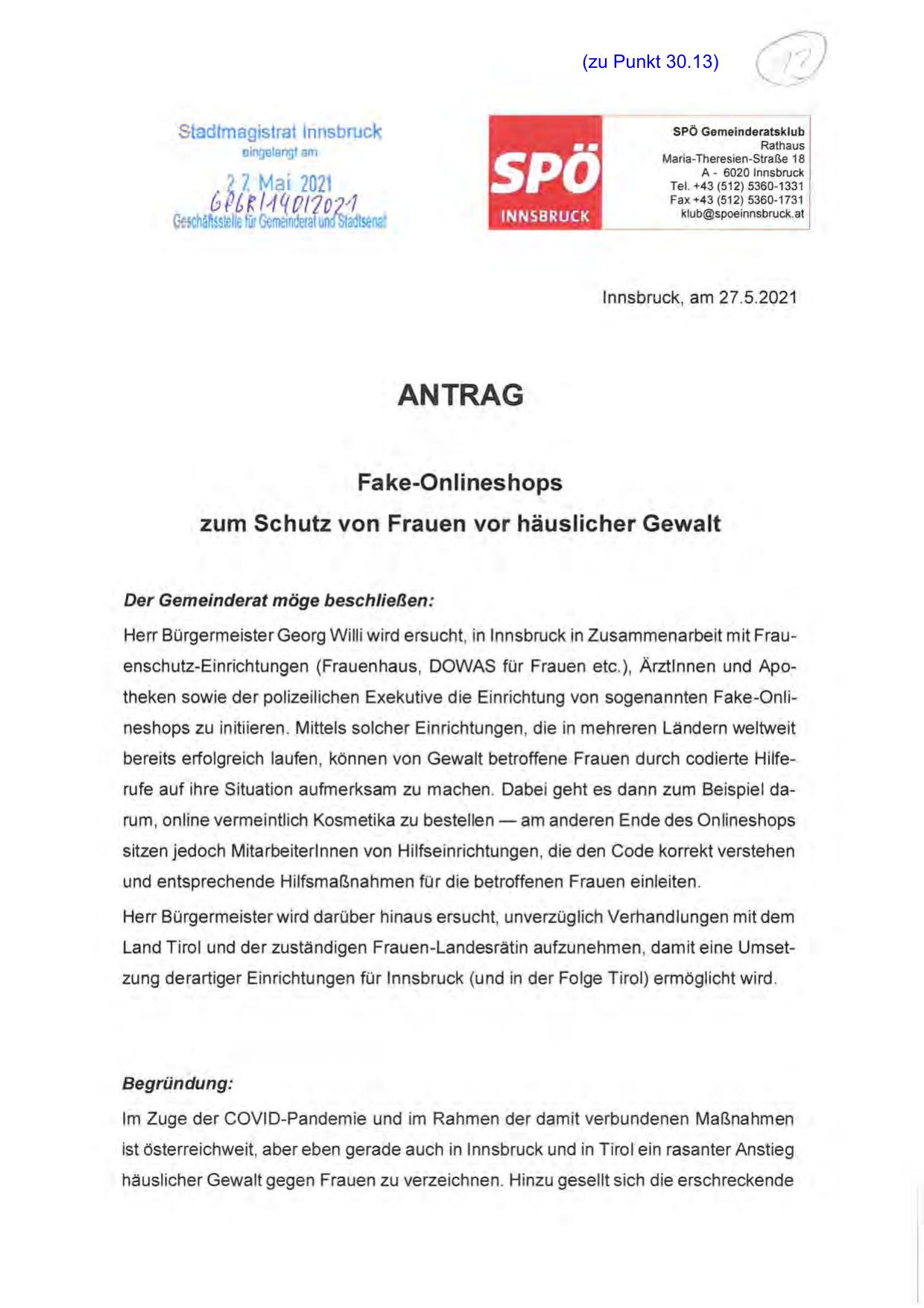 Herr Bürgermeister Georg Willi wird ersucht, in Innsbruck in Zusammenarbeit mit Frauenschutz-Einrichtungen (Frauenhaus, DOWAS für Frauen etc.), Ärztinnen und Apotheken sowie der polizeilichen Exekutive die Einrichtung von sogenannten Fake-Onlineshops zu initiieren . Mittels solcher Einrichtungen, die in mehreren Ländern weltweit