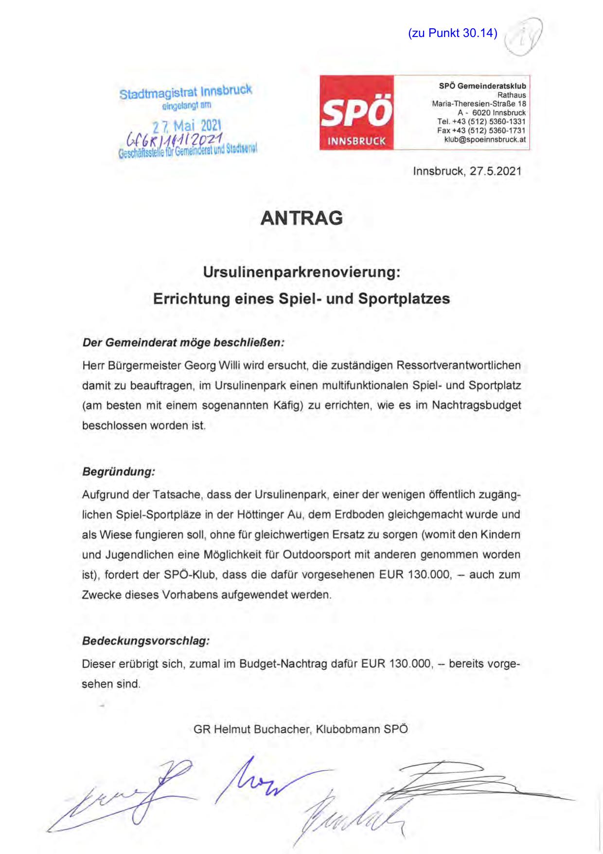 Aufgrund der Tatsache, dass der Ursulinenpark, einer der wenigen öffentlich zugänglichen Spiel-Sportpläze in der Höttinger Au , dem Erdboden gleichgemacht wurde und