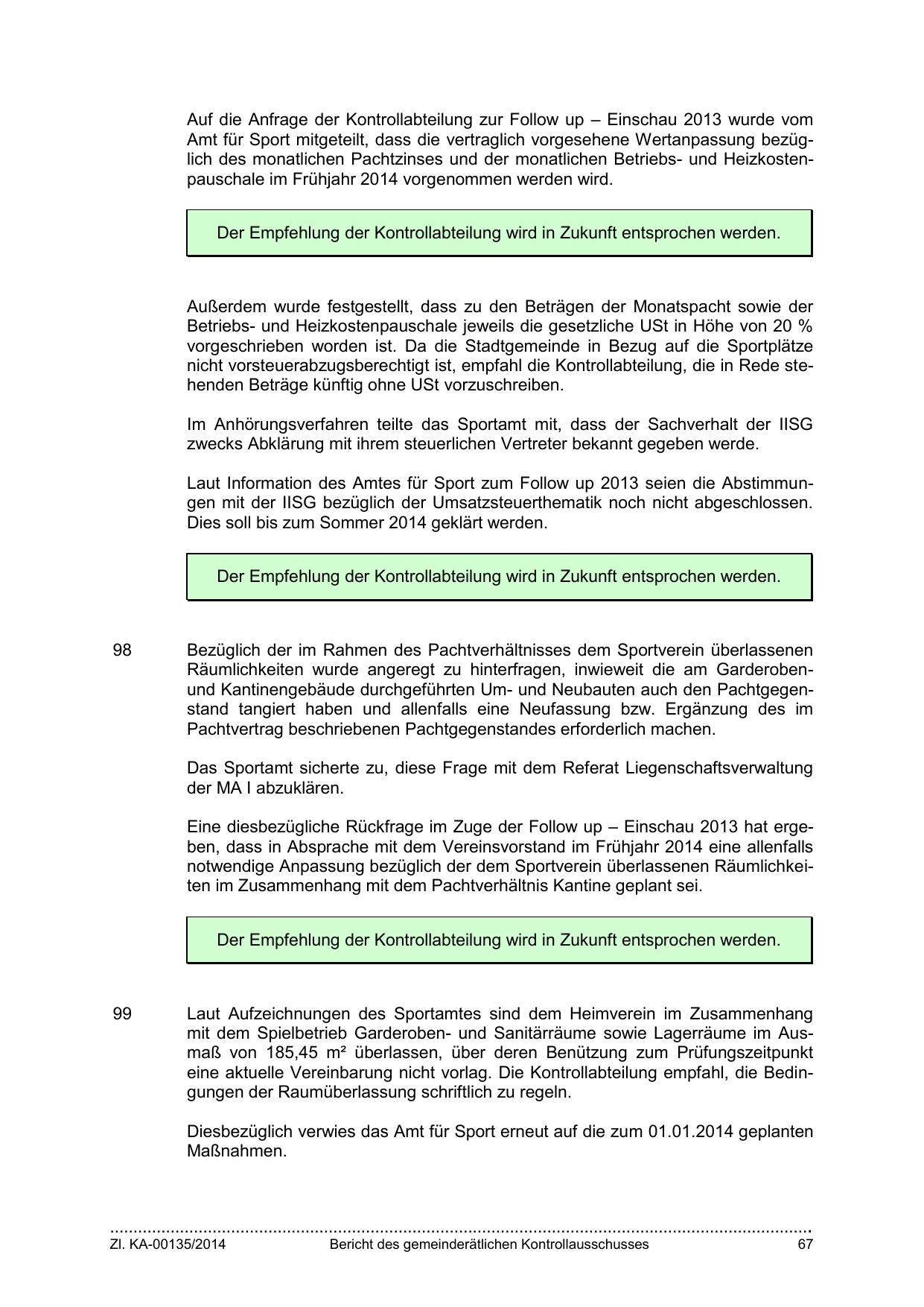 Der Empfehlung der Kontrollabteilung wird in Zukunft entsprochen werden.