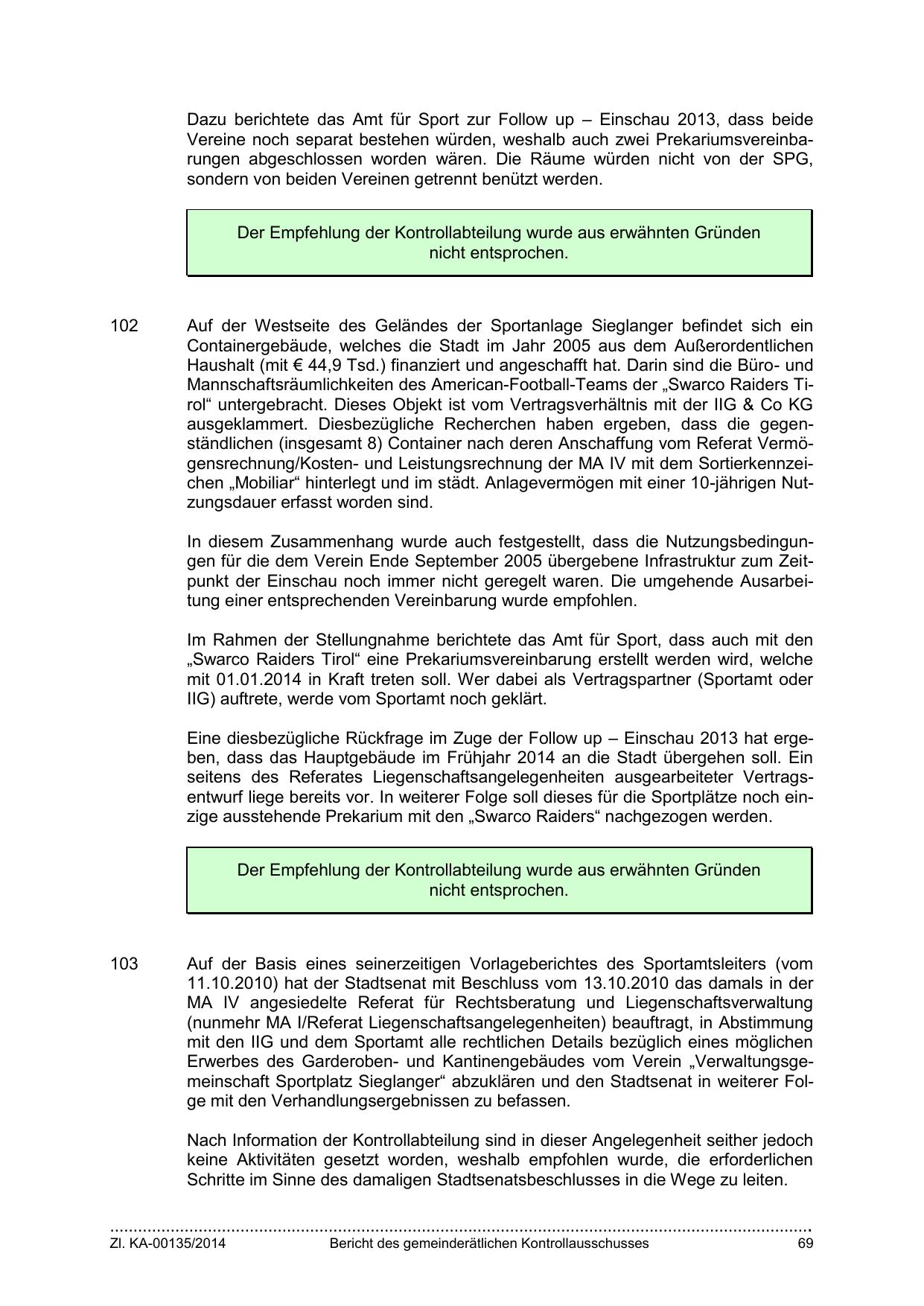 Mannschaftsräumlichkeiten des American-Football-Teams der „Swarco Raiders Tirol“ untergebracht. Dieses Objekt ist vom Vertragsverhältnis mit der IIG & Co KG