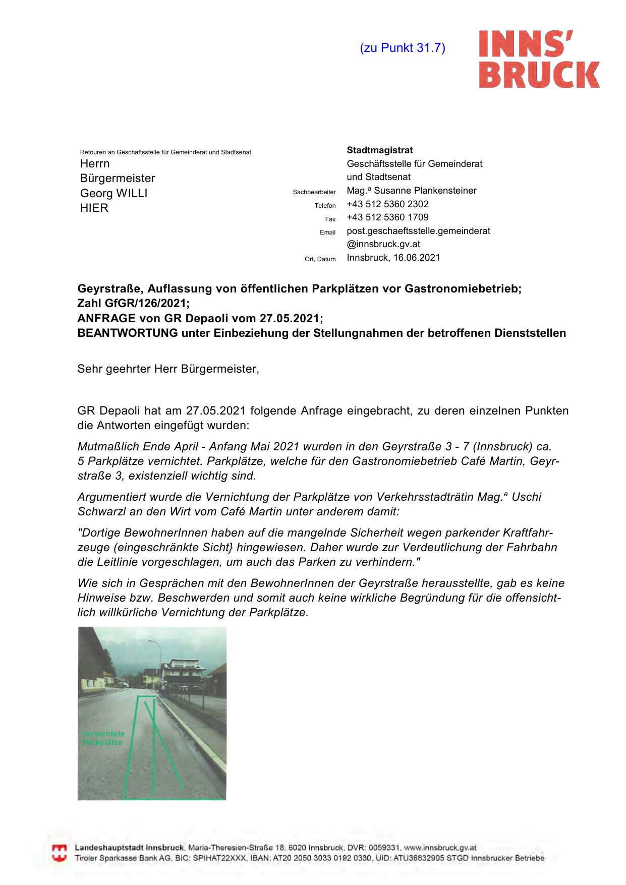 GR Depaoli hat am 27.05.2021 folgende Anfrage eingebracht, zu deren einzelnen Punkten
