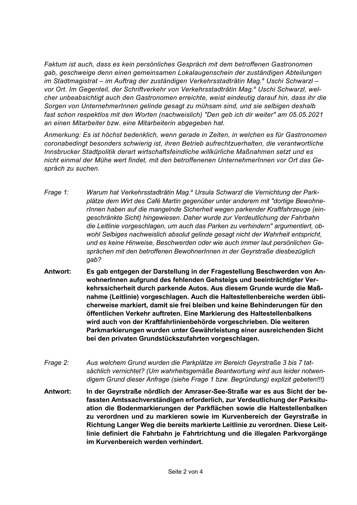 vor Ort. Im Gegenteil, der Schriftverkehr von Verkehrsstadträtin Mag.a Uschi Schwarzl, welcher unbeabsichtigt auch den Gastronomen erreichte, weist eindeutig darauf hin, dass ihr die