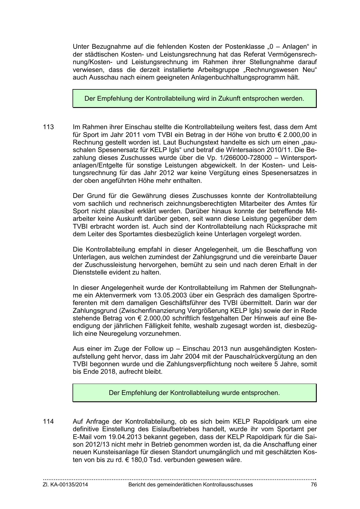 Rechnung gestellt worden ist. Laut Buchungstext handelte es sich um einen „pauschalen Spesenersatz für KELP Igls“ und betraf die Wintersaison 2010/11. Die Bezahlung dieses Zuschusses wurde über die Vp. 1/266000-728000 – Wintersportanlagen/Entgelte für sonstige Leistungen abgewickelt. In der Kosten- und Leistungsrechnung für das Jahr 2012 war keine Vergütung eines Spesenersatzes in