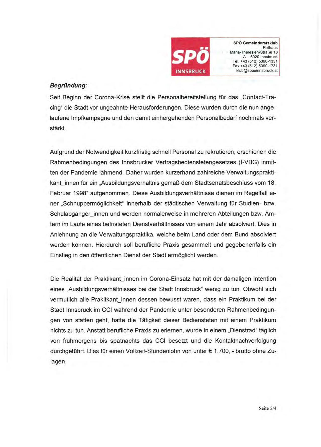 Rahmenbedingungen des lnnsbrucker Vertragsbed ienstetengesetzes (I-VBG) inmitten der Pandemie lähmend. Daher wurden kurzerhand zahlreiche Verwaltungspraktikant_innen für ein „Ausbildungsverhältnis gemäß dem Stadtsenatsbeschluss vom 18.