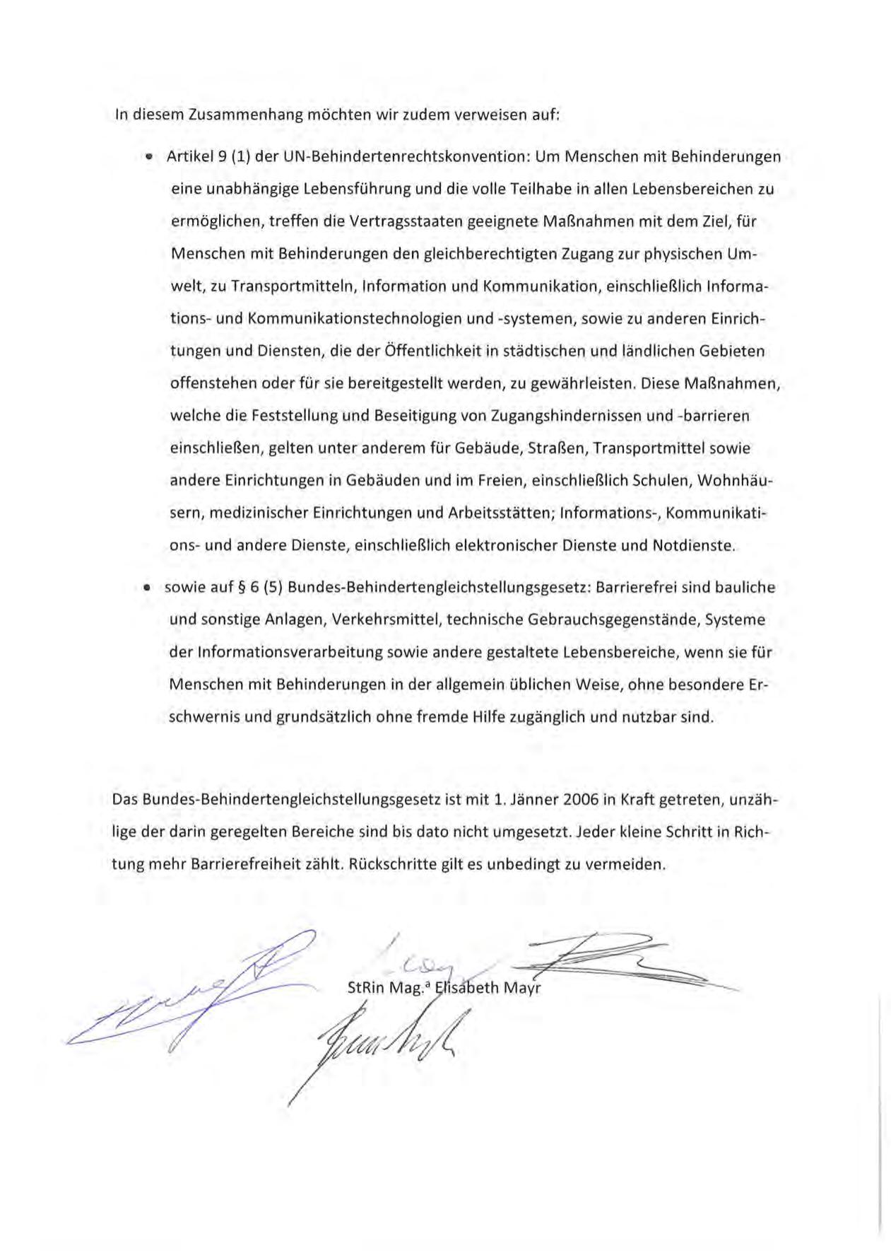 Das Bundes-Behindertengleichstellungsgesetz ist mit 1. Jänner 2006 in Kraft getreten, unzählige der darin geregelten Bereiche sind bis dato nicht umgesetzt. Jeder kleine Schritt in Richtung mehr Barrierefreiheit zählt . Rückschritte gilt es unbedingt zu vermeiden .
