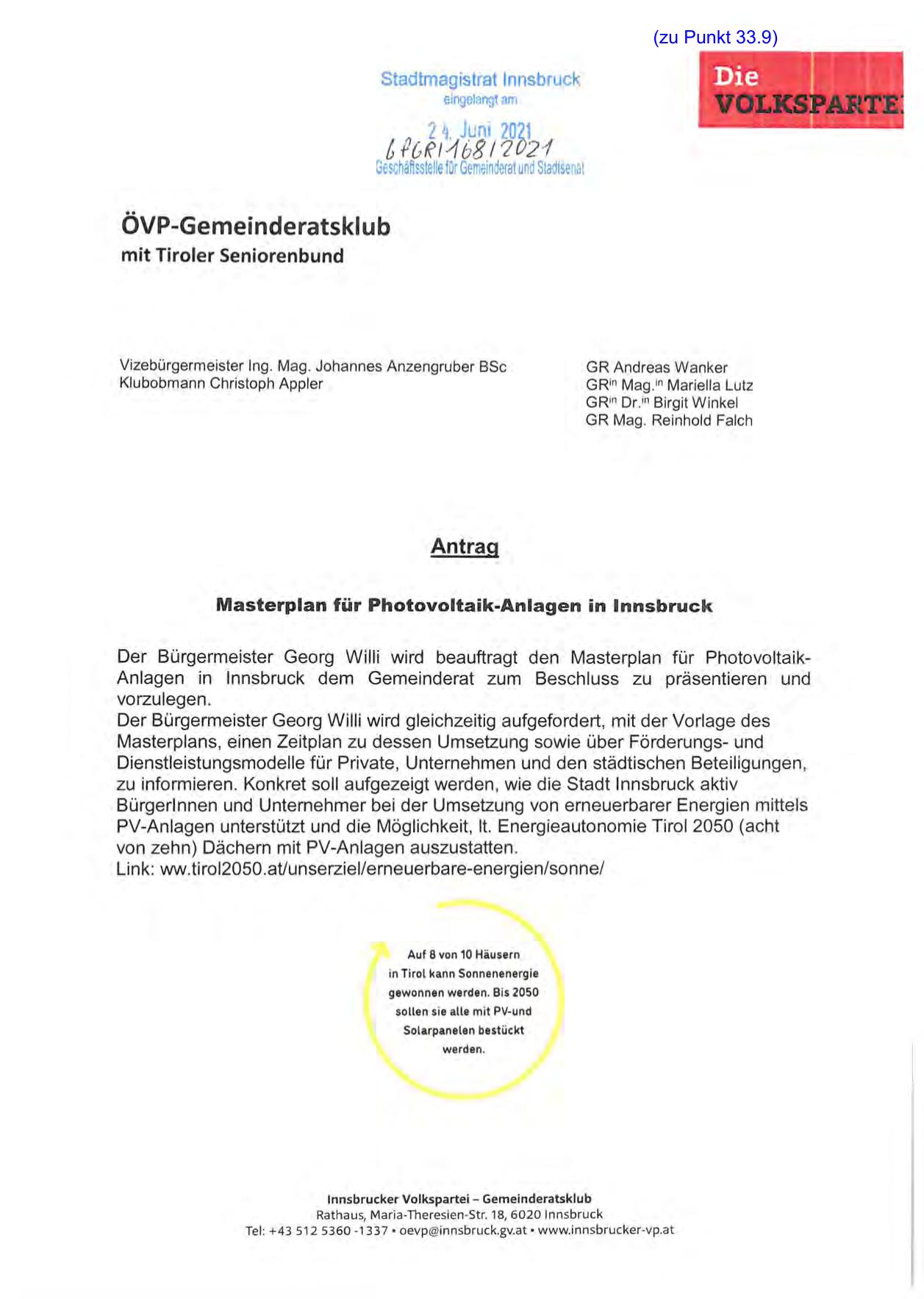 Der Bürgermeister Georg Willi wird beauftragt den Masterplan für PhotovoltaikAnlagen in Innsbruck dem Gemeinderat zum Beschluss zu präsentieren und