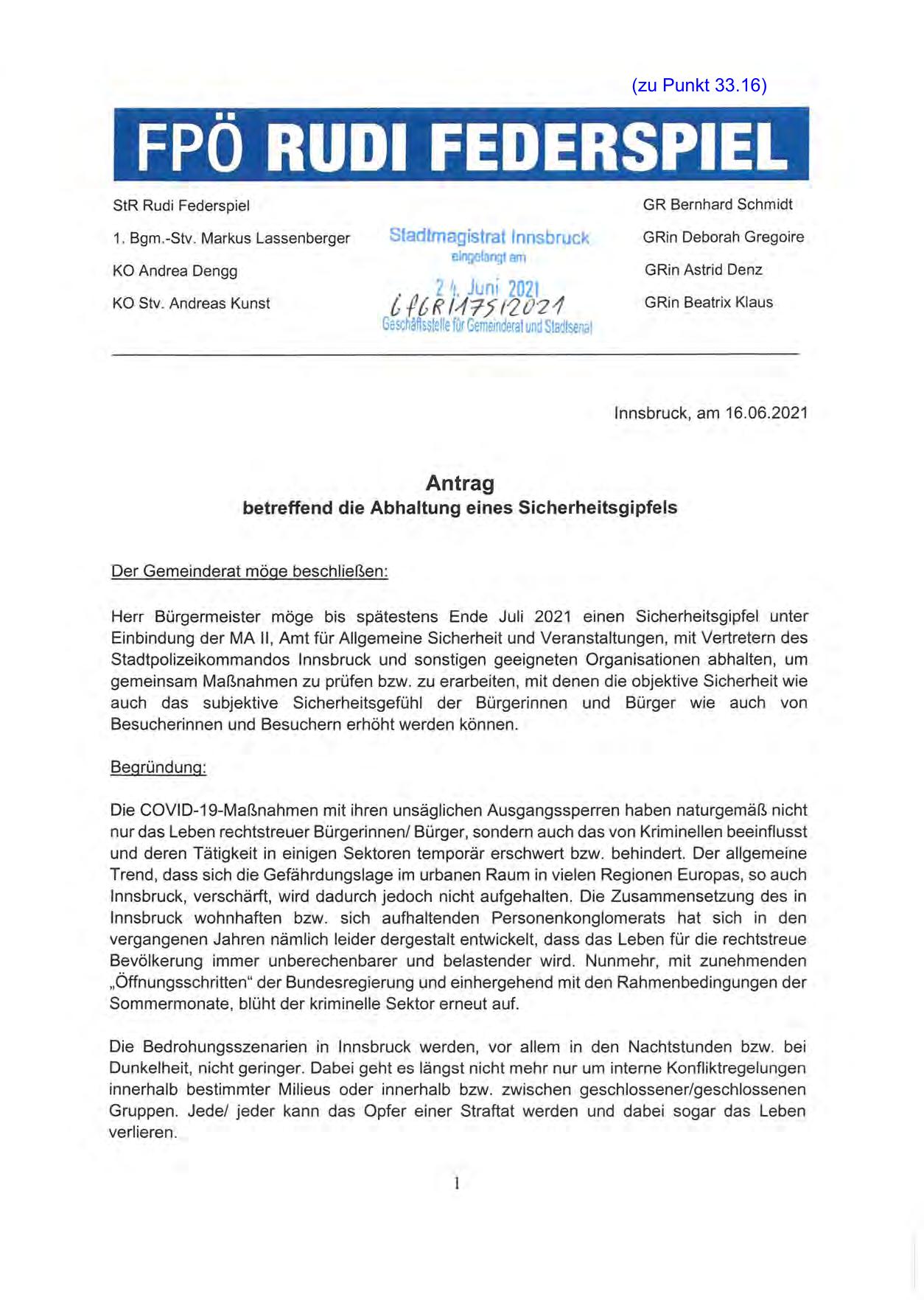 Herr Bürgermeister möge bis spätestens Ende Juli 2021 einen Sicherheitsgipfel unter